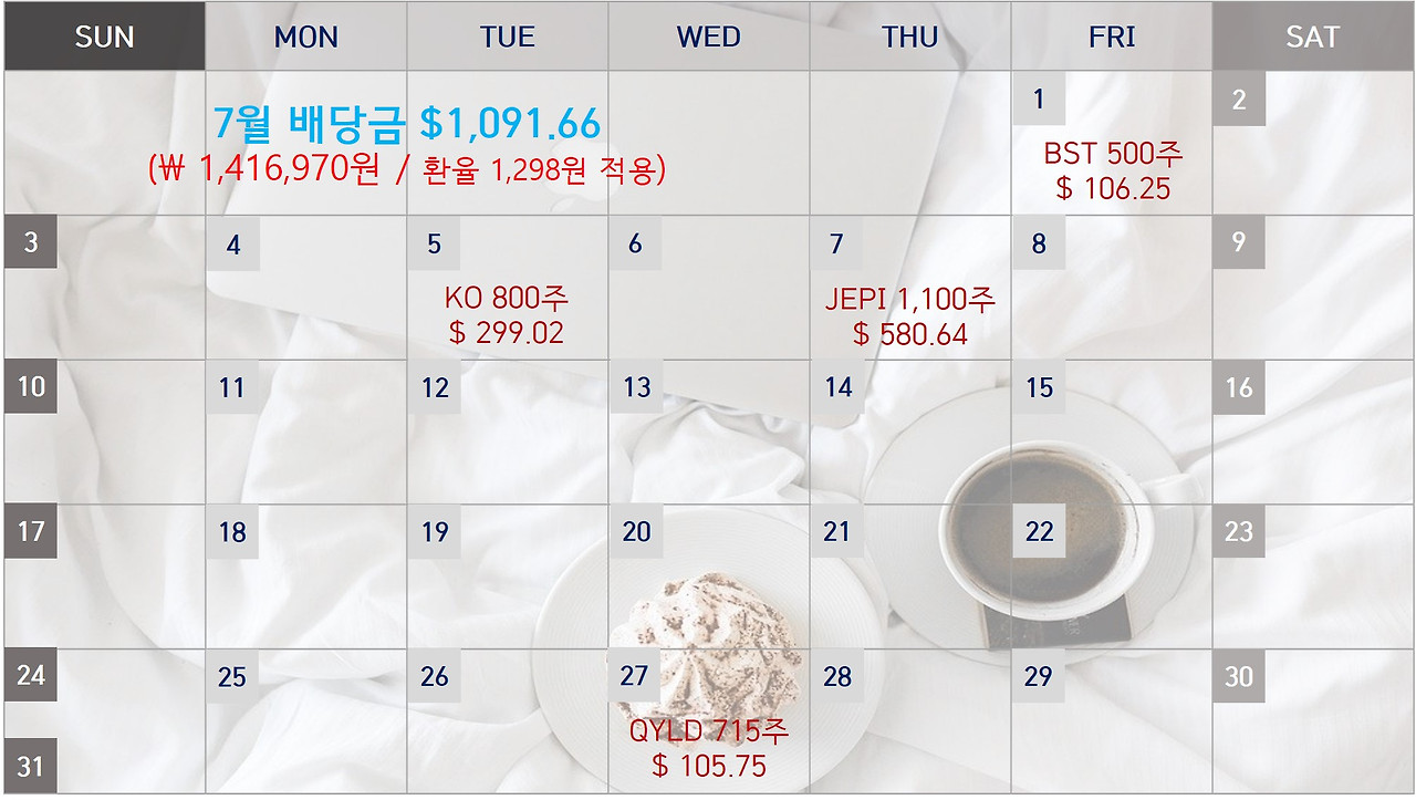 이렇게 7월에는 배당금 1,091.66달러를 받게 될 것이고, 저는 이 소중한 배당금을 재투자해서 QYLD와 SPYG ETF를 적립해갈 것입니다.