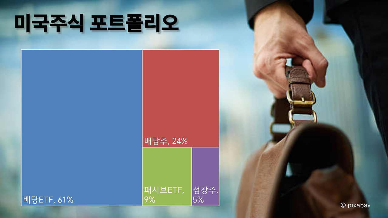 저는 배당주 성향의 투자자로 전체 포트내에 배당ETF가 61%로 가장 높은 점유비를 차지하고 있고, 배당주 개별종목이 24%로 배당을 목적으로 투자한 종목 점유비가 85%입니다. 시장 지수를 추종하는 패시브 ETF 점유비가 9%이고 성장주 투자 구성비는 5%입니다. 매월 적립식으로 투자하고 있는 시장지수를 추종하는 패시브ETF 비중이 조금씩 늘어나고 있는데, 궁극적으로는 패시브 ETF 구성비를 20%까지 높여갈 계획입니다.