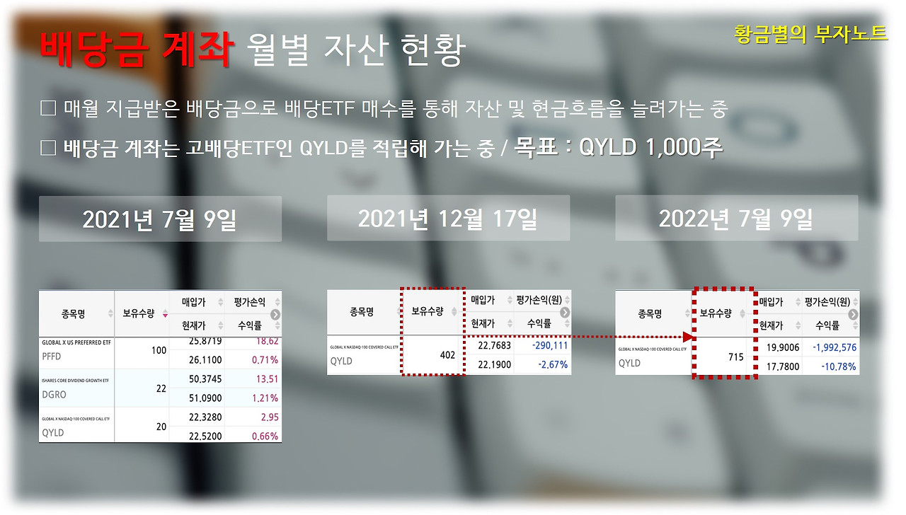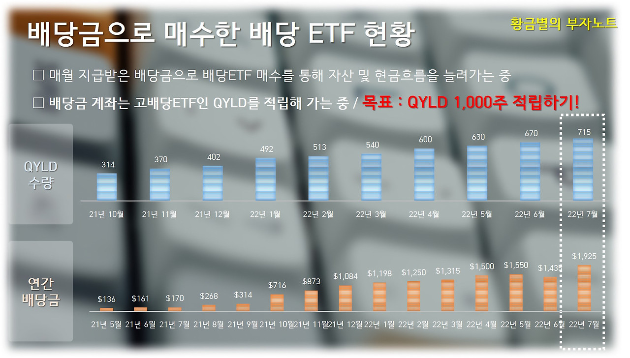 미국주식 배당주 중심의 투자로 매월 받는 배당금 수령 현황과 적립한 배당금을 어떻게 투자해서 미국주식 투자자산을 운용해가고 있는지 영상을 통해 공유해드리고 있습니다. 저는 이렇게 매월 받는 배당금을 재투자해서 고배당 ETF인 QYLD ETF를 매수해가고 있는대요, 작년 1월부터 올해 7월까지 19개월간 받은 배당금을 재투자한 결과 이제 QYLD ETF 715주와 SPYG 8주를 적립하게 되었습니다. 미국 배당주와 배당 ETF에 투자하면서 1차로 잡은 목표가 매월 받는 배당금을 꾸준히 재투자해서 QYLD ETF 1,000주를 적립하는 것인데, 이제 목표 달성까지 70% 구간을 넘었습니다. 일관성있는 꾸준한 투자로 1차 목표를 달성한 후에, QYLD ETF 1,000주의 배당금으로 또 다른 새로운 시너지를 만들어가는 투자과정을 시청자분들과 같이 공유해 가고자 합니다.