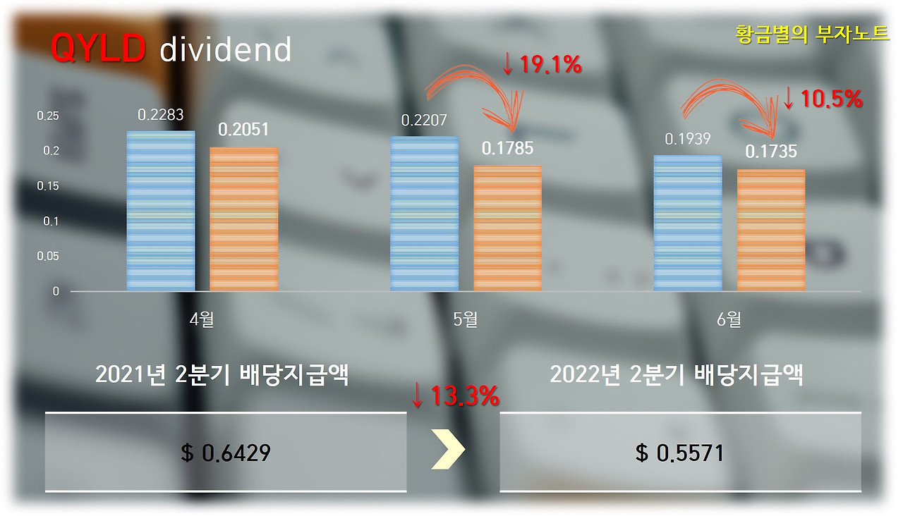 QYLD는 2022년 2분기에 주당 0.5571달러를 배당으로 지급해서 전년 동기간 대비 13.3% 배당지급액이 감소했습니다. 2분기 4월, 5월, 6월 3개월 모두 전년 동월보다 배당지급액이 감소했구요. 특히 5월에는 전년 동월 대비해서 -19.1%나 배당지급액이 줄어들었습니다. 올해 들어 나스닥100 지수가 연이어 급락장을 연출하면서 QYLD 주가도 많이 하락했는데요. 주가가 하락하면서 배당지급액도 줄어들면 투자자는 굉장히 불안해질 수 밖에 없습니다. 코카콜라와 같은 배당킹 종목들은 수많은 경제위기에도 불구하고 배당금을 줄이지 않고 50년 이상 배당지급액을 증액시켜왔기 때문에 투자자들이 종목을 믿고 견딜 수 있는 것인대요. QYLD는 SCHD나 DGRO같이 매년 배당이 증가하는 배당성장형 ETF와는 달리 주가가 하락하면 배당금도 감소할 수 있다는 점을 투자자들은 염두에 두셔야 할 것 같습니다.
