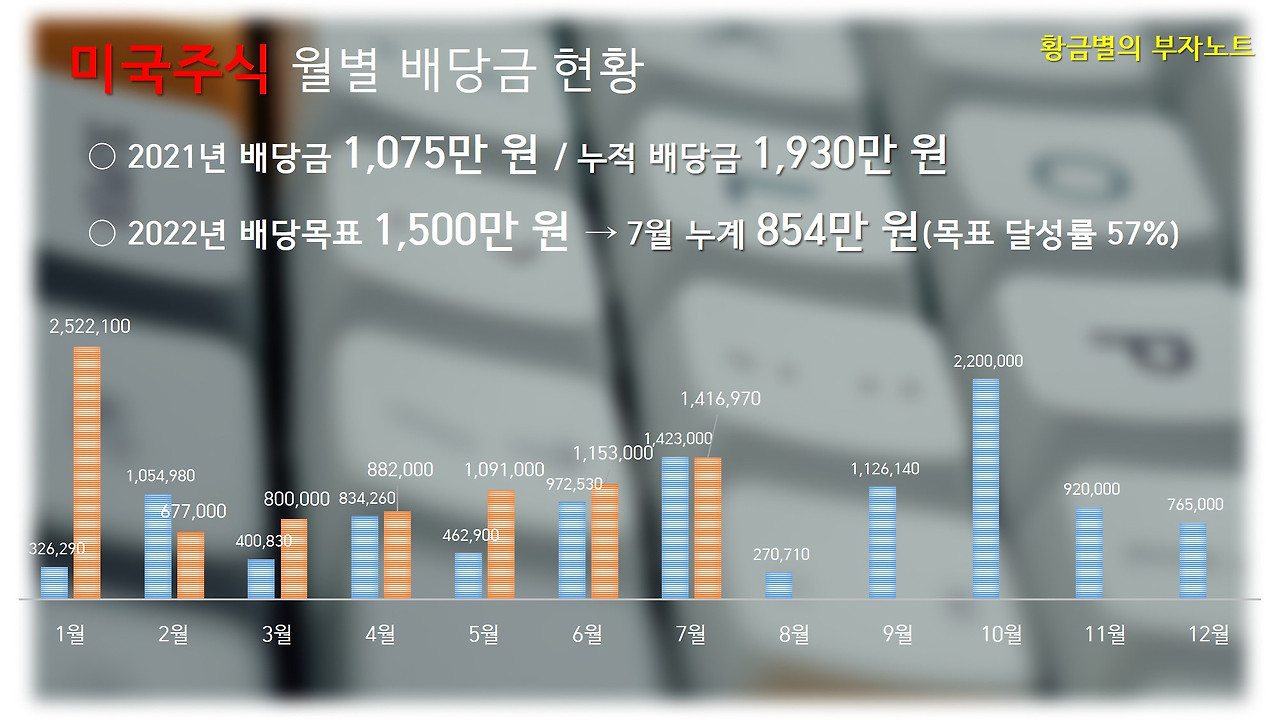 작년 1월부터 올해 7월까지 19개월간 누적 배당금은 약 1,930만 원 가량입니다. 올해 2022년 배당금 목표는 1,500만 원이고, 7월까지 854만 원의 배당금을 수령해서 현재 진도율 57%입니다. 제가 미국주식 투자하면서 배당금으로 3천만 원까지만 적립하게 되면 시장에서 오래 살아남을 충분한 시드 기반이 될 수 있을거라고 목표를 세웠는데, 어느덧 2/3 지점에 도달했네요. 이제 하반기가 시작되었으니 올해 목표를 꼭 달성할 수 있도록 한눈 팔지 않고 꾸준히 적립해갈 계획입니다.