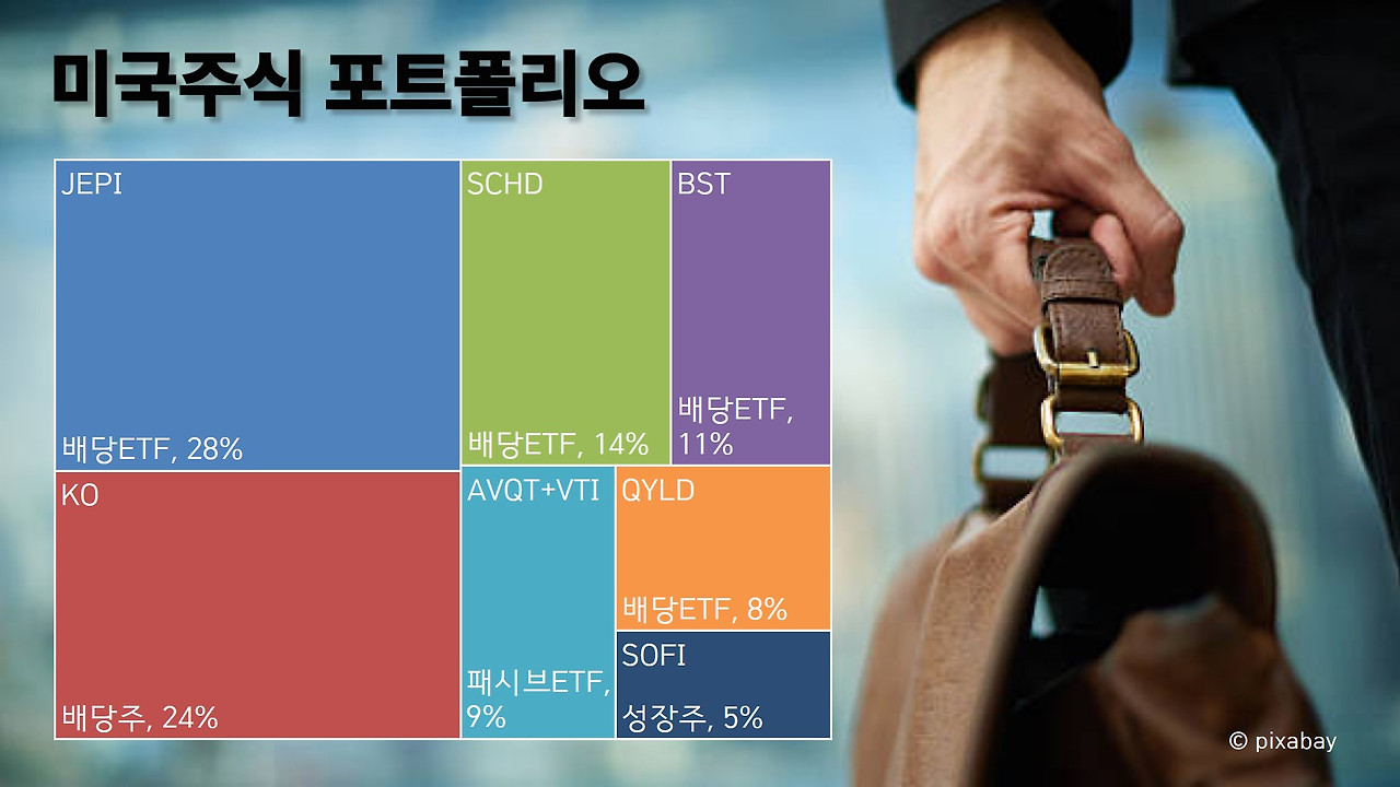 현재 종목별 포트 구성입니다. JEPI가 28% 구성비로 영원한 배당킹 코카콜라를 제치고 1위로 올라섰고, SCHD가 3위로 14%의 구성비, BST 11%, 그리고 매월 1주씩 매수해가는 AVQT와 미국 전체 기업에 투자하는 VTI 구성비가 9%이고, 매월 배당금으로 적립해가는 QYLD도 포트내 점유율이 8%까지 상승했습니다.