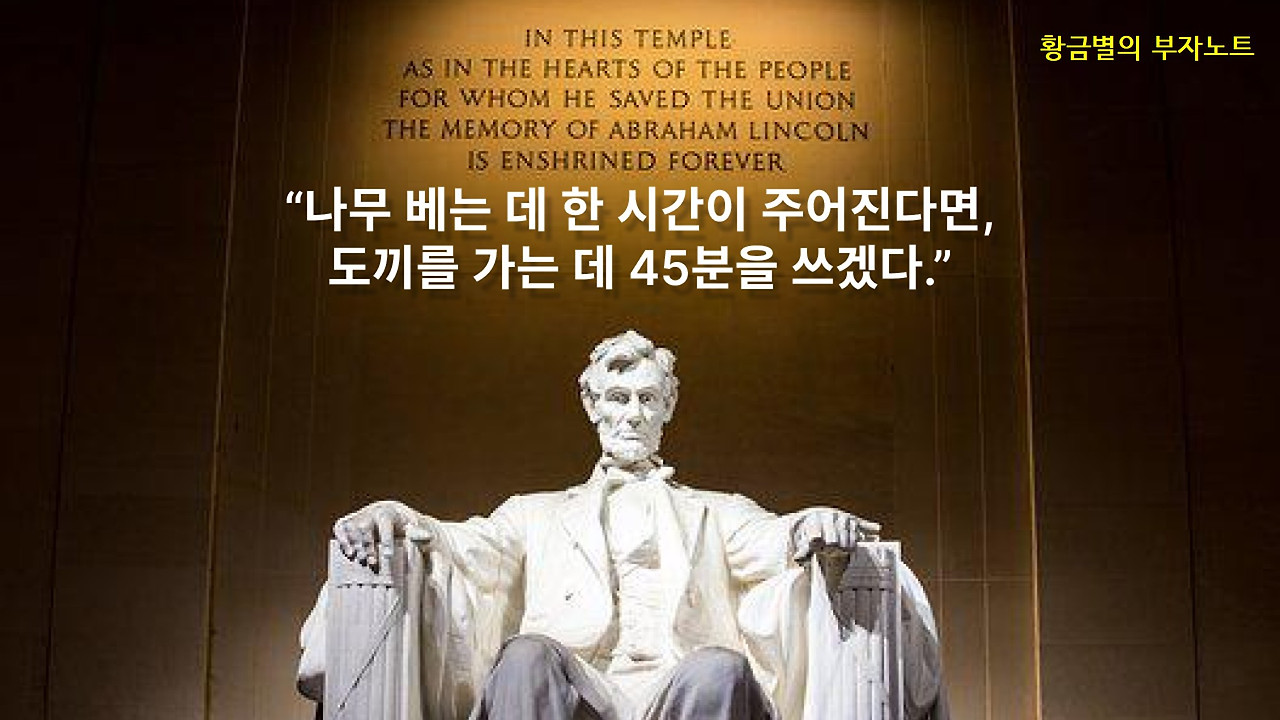 미국의 16대 대통령 에이브러햄 링컨은 다음과 같이 말했습니다. “나무 베는 데 한 시간이 주어진다면, 도끼를 가는 데 45분을 쓰겠다.” 대부분의 사람이라면 한 시간 동안 나무를 베라고 하면 무뎌진 도끼 날을 확인도 하지 않고 나무부터 베려고 할 것입니다. 당연히 힘은 더 들어갈테고 지쳐서 나무를 많이 베지 못하겠죠. 하지만 어떻게 나무를 잘 벨지를 고민하며 도끼를 갈며 45분이라는 생각의 시간을 가진다면, 잘 갈려진 날카로운 도끼날로 45분 전부터 나무 베기를 시작한 사람보다 힘을 적게 들이며 더 많은 나무를 벨 수 있을 것입니다.