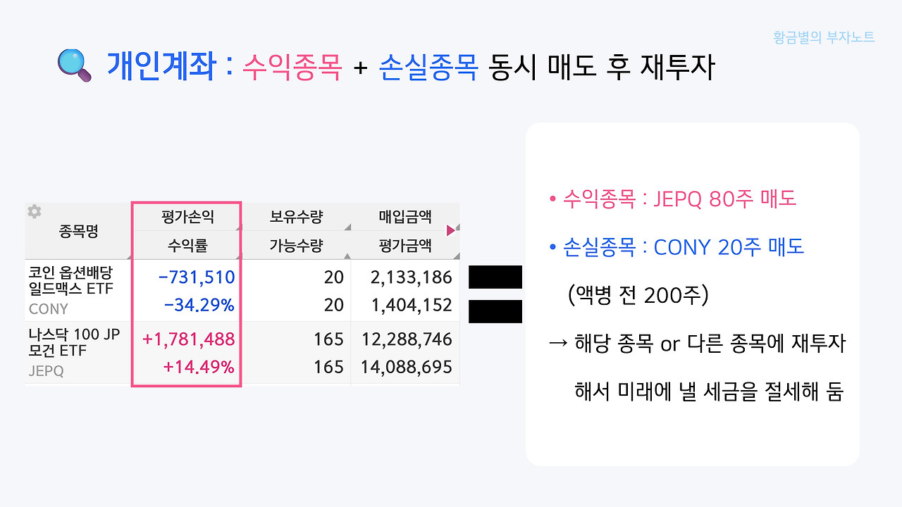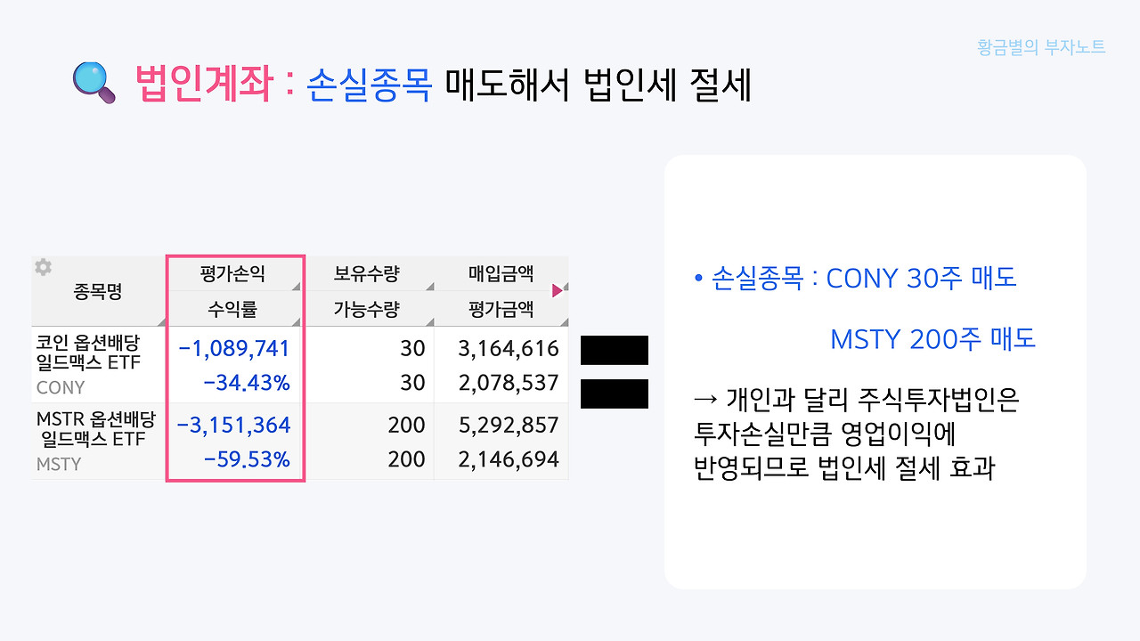 화면에 보이는 것처럼 저는 -34%의 평가 손실 중이던 CONY 30주, 그리고 -60%라는 큰 평가 손실 중이던 MSTY ETF 200주도 매도했습니다. 개인 계좌에서는 투자 손실을 상계하기 위해 수익 종목이 필요했지만, 법인 계좌에서는 투자 손실만으로도 세금 절감 효과가 발생하기 때문에, 수익이 난 종목은 미래를 위해 그대로 가져가고 손실 난 종목만 매도를 하더라도 법인세 절세 효과를 얻어갈 수 있습니다. 즉, 손실 종목을 정리하는 것 자체가 절세 효과가 되는 법인의 구조를 적극 활용한 것이죠.