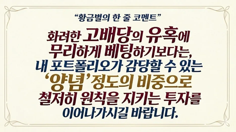 자, 오늘은 이렇게 제 포트폴리오 내의 YieldMax ETF 투자 현황과 저만의 운용 원칙 4가지를 정리해 드렸습니다. 앞서 보신 것처럼 저는 원금을 모두 회수했거나 배당금으로만 모은 자산을 활용해, 전체 포트폴리오의 1% 수준에서만 제한적으로 일드맥스 종목들을 운용하고 있습니다. 시청자 여러분께 꼭 전해드리고 싶은 말씀은 '화려한 고배당의 유혹에 무리하게 베팅하기보다는, 내 포트폴리오가 감당할 수 있는 양념 정도의 비중으로 철저히 원칙을 지키는 투자를 이어나가시길 바랍니다.’ 배당 투자는 속도보다 방향이 중요합니다. 여러분도 시장의 변동성에 흔들림 없이, 든든한 평생 연금을 디자인해 나가는 데 어떤 배당 ETF가 나한테 적합한지 잘 판단해보시기 바랍니다.