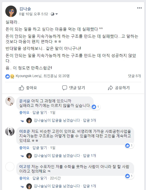 그래.. 나도, 내가 좋아하는 사람들도, 돈이 안 되는 일을 하고 싶어 하고, 하고 있는 사람들이 많은 것 같다.