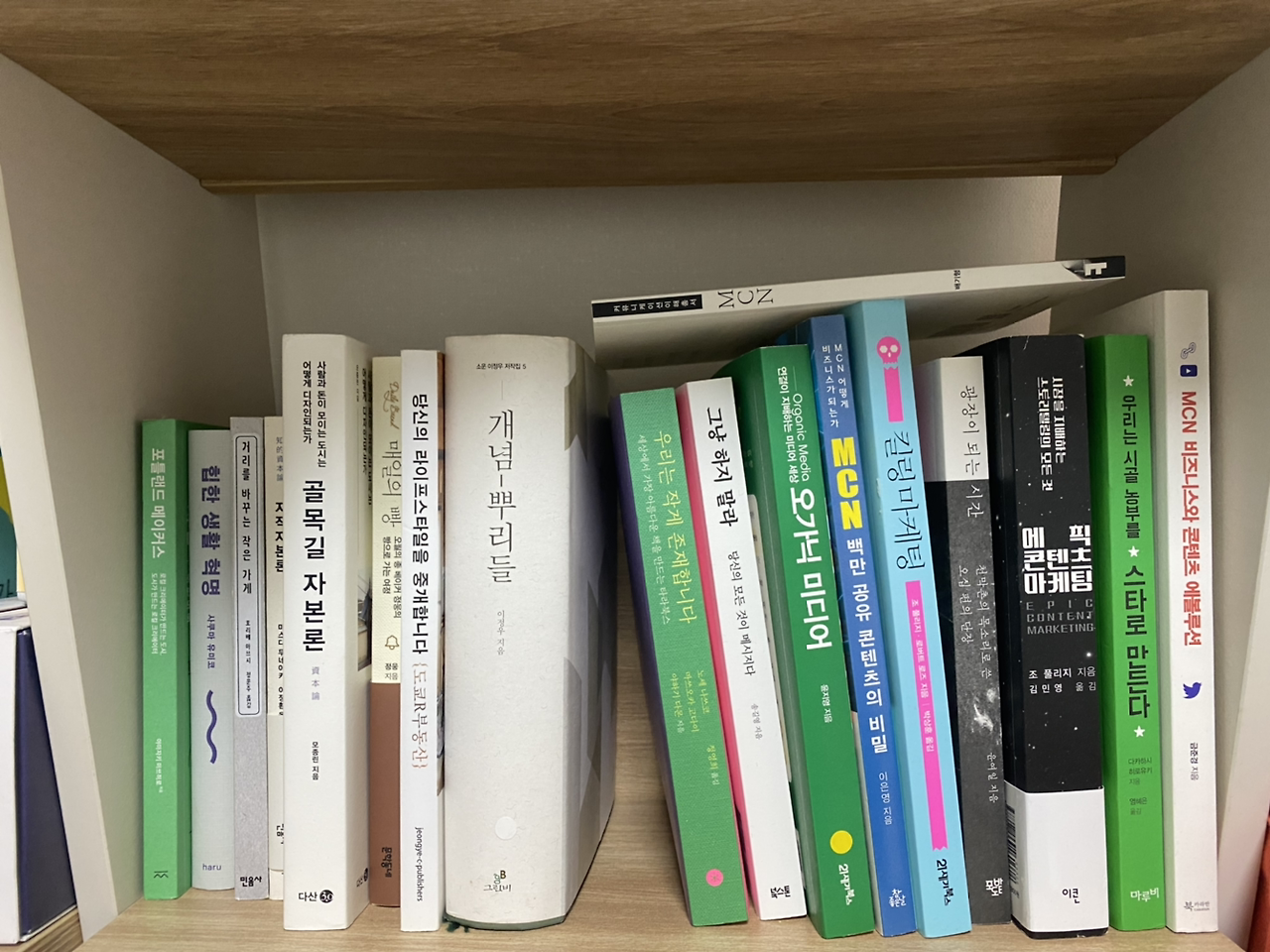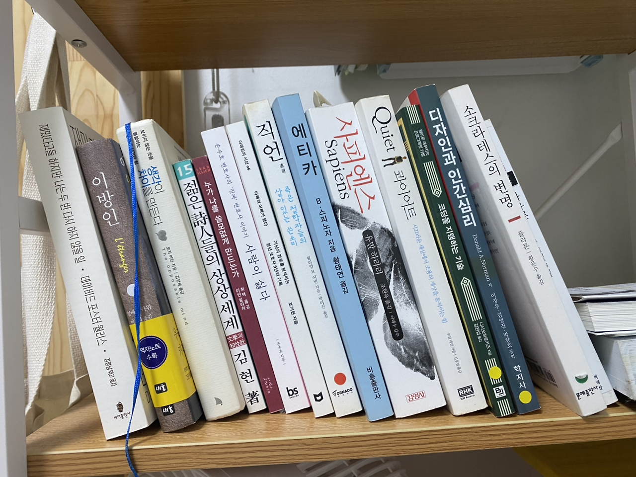 감정의 여파가 누그러지고 나니 편안해졌다. 그런데 이 방법, 즉 늘어놓고, 그룹화하고, 바라보는 방법이 상당히 마음에 들어서 뭔가에 또 적용해 보고 싶어졌다. 오랫동안 손대지 못한, 책장 정리에 적용해 보기로 했다. 우선은 책장에 꽂힌 책들 전체를 보면서 키워드나 키워드는 주제에 한정하지 않았다. 책들을 바라보니 과거에 사용하지 않았던 키워드가 보였다. 바로 “사람”이었다. 책의 내용이 아니라, 나는 어떤 사람을 알기 때문에, 갖고 있는 책이 꽤 많았다. 그 사람이 쓴 책, 그 사람이 선물해준 책, 그 사람이 추천해준 책, 그 사람이 작업한 책 등. 다른 것은 주제가 키워드였다. 카테고리를 설정할 만한 키워드를 꼽으니 열개 정도 였다. 하나씩 채워나갔다. 모두 채워 넣으니, 가장 많은 책을 포함한 카테고리가 “사람” 이었다. 책장에는 “지인”이라고 카테고리를 넣었다. 아.. 그래서 과거에 책장 정리가 어려웠었구나. 사람 때문에 보관하는 책을 주제로 구분하려고 했으니 힘들었던 거구나.