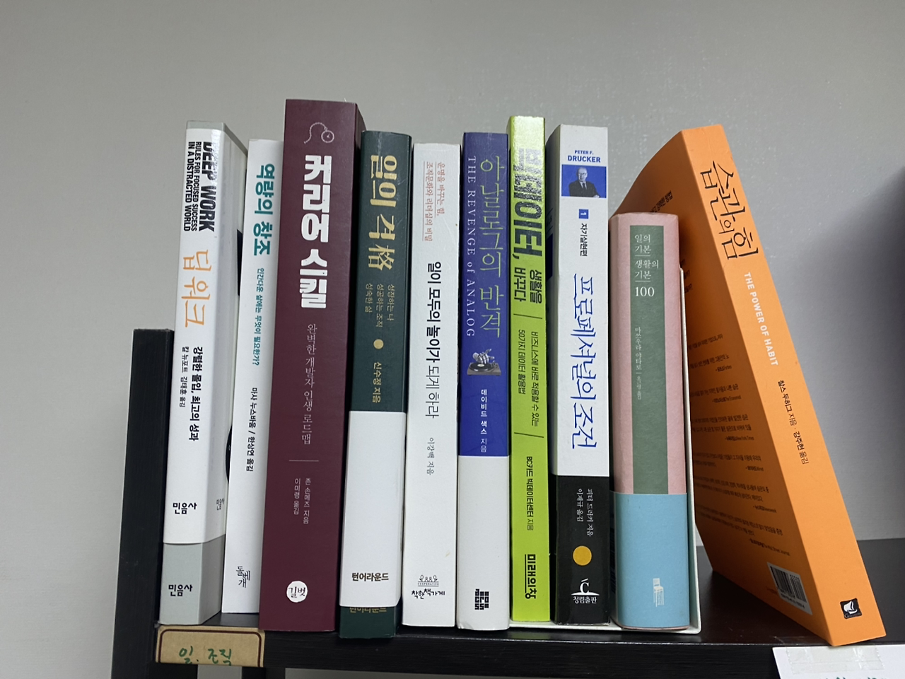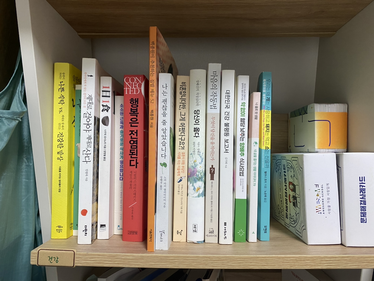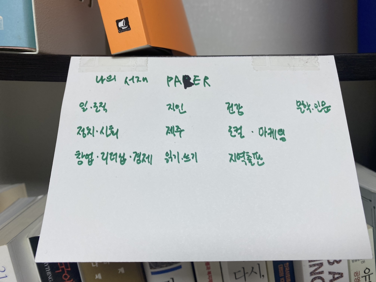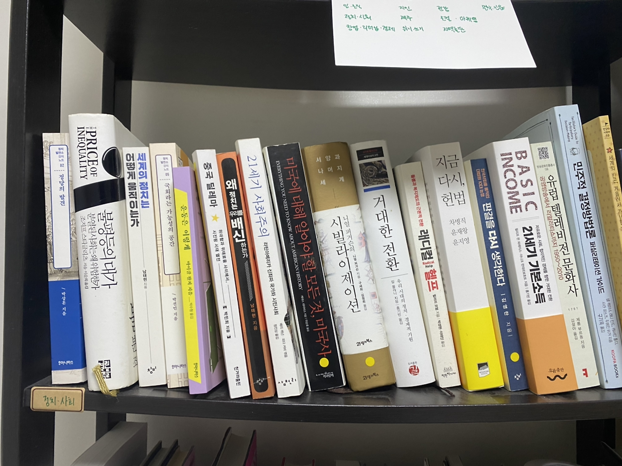 예전에는 책장이 정리가 안 되어 있으니 책장을 보아도 눈에 들어오지를 않고, 책 무더기로 보여서 별로 책을 보고 싶지가 않았다. 특정 책을 찾으려고 해도 찾기가 어려웠다. 이제는 책장의 카테고리를 머릿속으로 읊을 수도 있다. 책장에 카테고리를 적어놓기도 했다. 각 카테고리 좌측 하단에는 카테고리 명도 적어서 붙여 두었다.