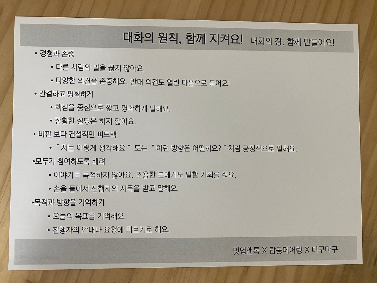 그리고 참가하신 분들 각자의 활동에 대한 소개와 어떤 마음으로 이 자리에 오셨는지 간단히 이야기 나누었습니다. 건강한 대화의 장을 만들어 가기 위해 대화의 원칙도 함께 공유했습니다. - 경청, 존중, 배려, 간결, 건설적, 모두의 참여, 목적 기억하기.