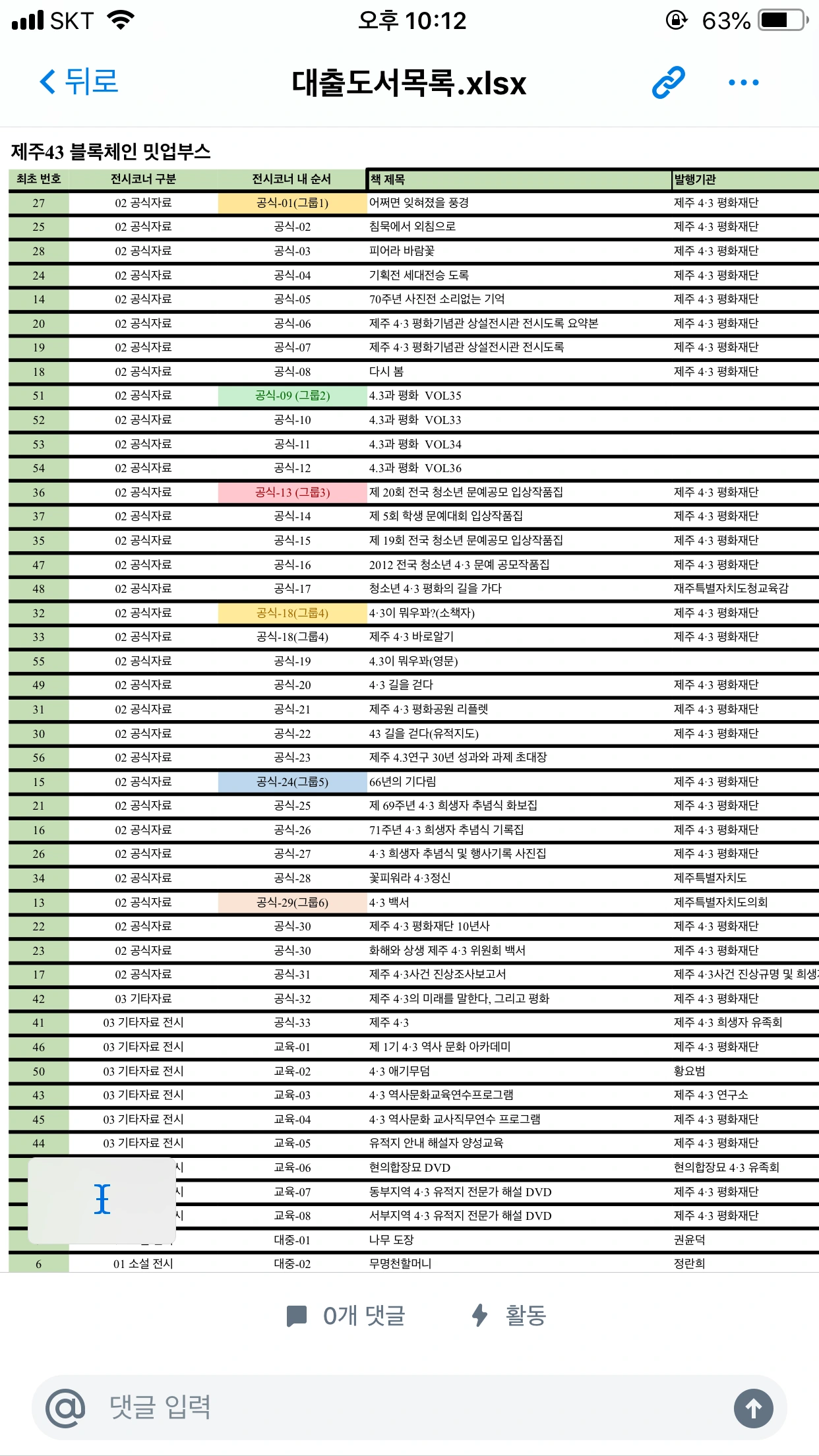 나는 전시할 순서대로 책의 제목을 부를테니, 엑셀에서 책 의 제목을 찾아서 전시그룹 + 전시그룹내 번호를 엑셀에 적어달라고 했다.