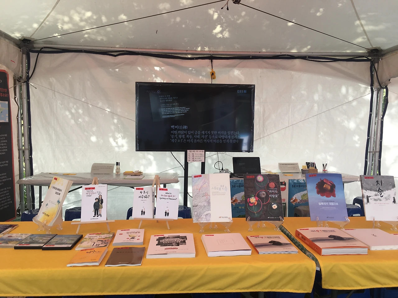 전시부스 테이블에 노란천을 깔고 소형 이젤을 깔았다. 약 7개의 종이가방에 나뉘어 들어있는 책들을 꺼냈다.