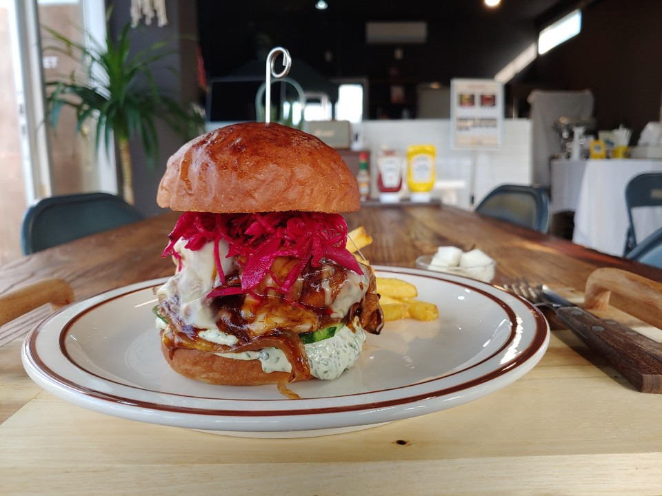 풀드버거는 제주산돼지고기를 10시간 이상 조리하여 고기를 부드럽게 만든 후에 얇게 찢어 BBQ소스와 함께 나가고 있구요, 양배추와 비트로 색이 빨갛게 되어 있고 무와 톳이 들어간 피클이 같이 제공됩니다. 풀드는 돼지고기를 저온조리한 걸 말해요~