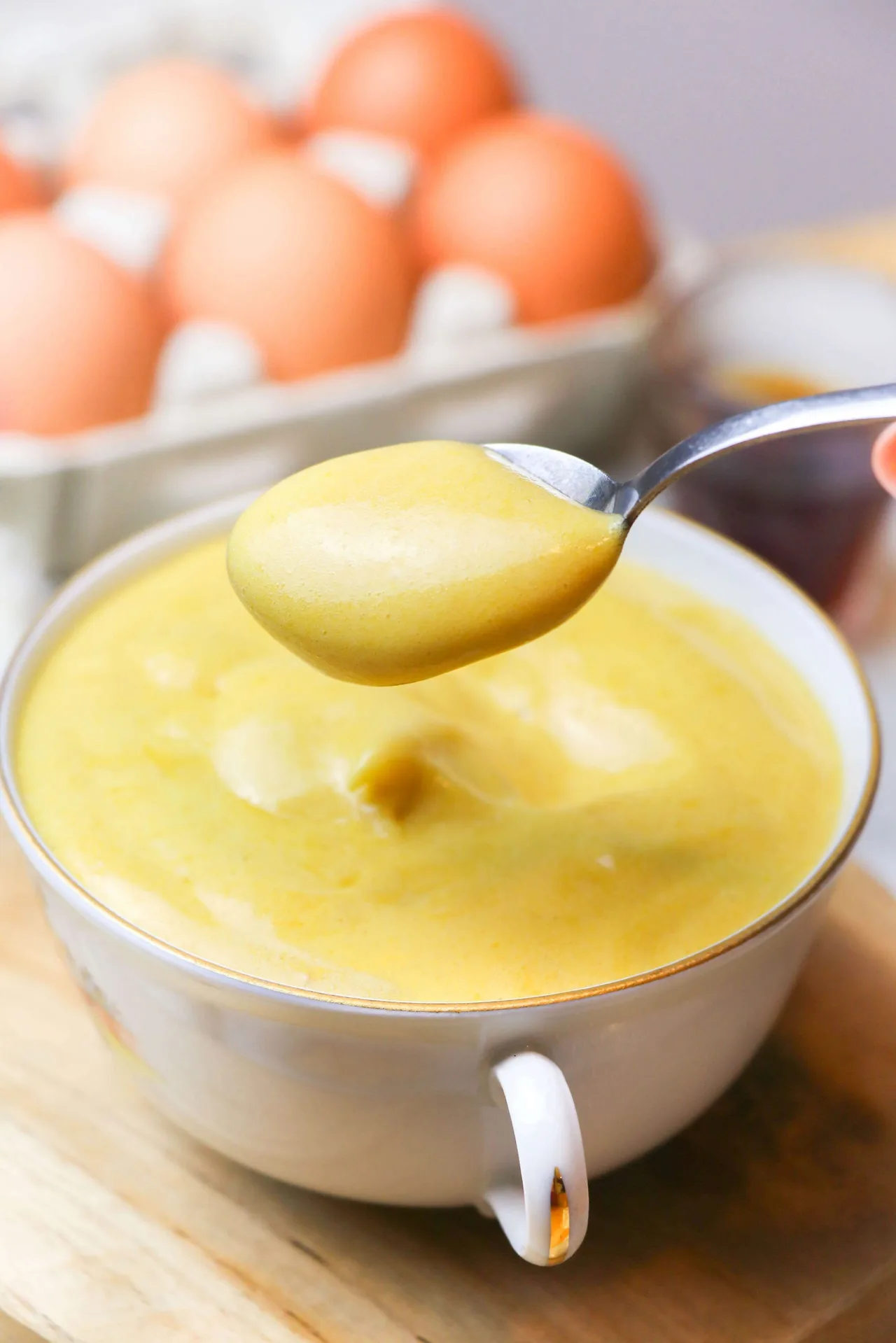 6) 거품기로 저을 때 거품기 지나간 자국이 바닥에 살짝살짝 보이기 시작하면 거의 다 된 겁니다. 너무 오래 가열하면 갑자기 계란 노른자가 응고되면서 계란죽이 되니 조심해 주세요.