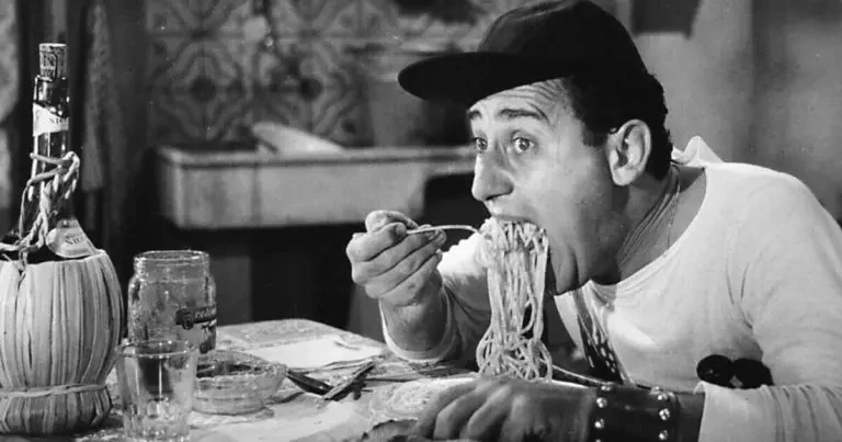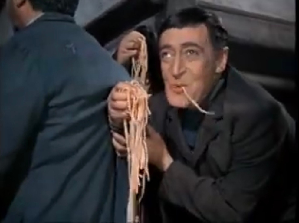 역시 1954년에 개봉한 또다른 이탈리아의 국민 배우 토토(Totò)가 나오는 이탈리아 영화 'Miseria e nobiltà'를 보면 이탈리아 인들의 파스타에 대한 열망을 생생하게 눈으로 확인할 수 있어요. 하얀 조리복의 요리사가 김이 펄펄 나는 토마토 스파게티가 봉긋하게 담긴 수프 그릇을 식탁 가운데에 두고 퇴장합니다. 여자 셋, 남자 둘의 다섯 사람은 식탁에서 거리를 두고 둘러앉아 이글거리는 욕망이 담긴 눈빛으로 군침을 삼키며 스파게티 그릇을 쳐다보지요. 주걱턱으로 유명한 배우 토토는 자기도 모르게 먼저 의자를 조금 당겨 앉습니다. 그러자 0.1초도 안 되어 다른 네 사람도 바로 바짝 식탁 쪽으로 당겨 앉지요. 다섯 사람은 파스타 그릇을 향해 경주를 하듯 의자를 바짝바짝 당겨 앉으며 눈치 싸움을 하지요. 그리고는 누구랄 것도 없이 갑자기 파스타 그릇에 달려들어 스파게티를 손에 잡히는 대로 한 움큼 집어 입으로, 그것도 모자라 양복 양쪽 주머니 속으로도 마구 집어넣습니다.