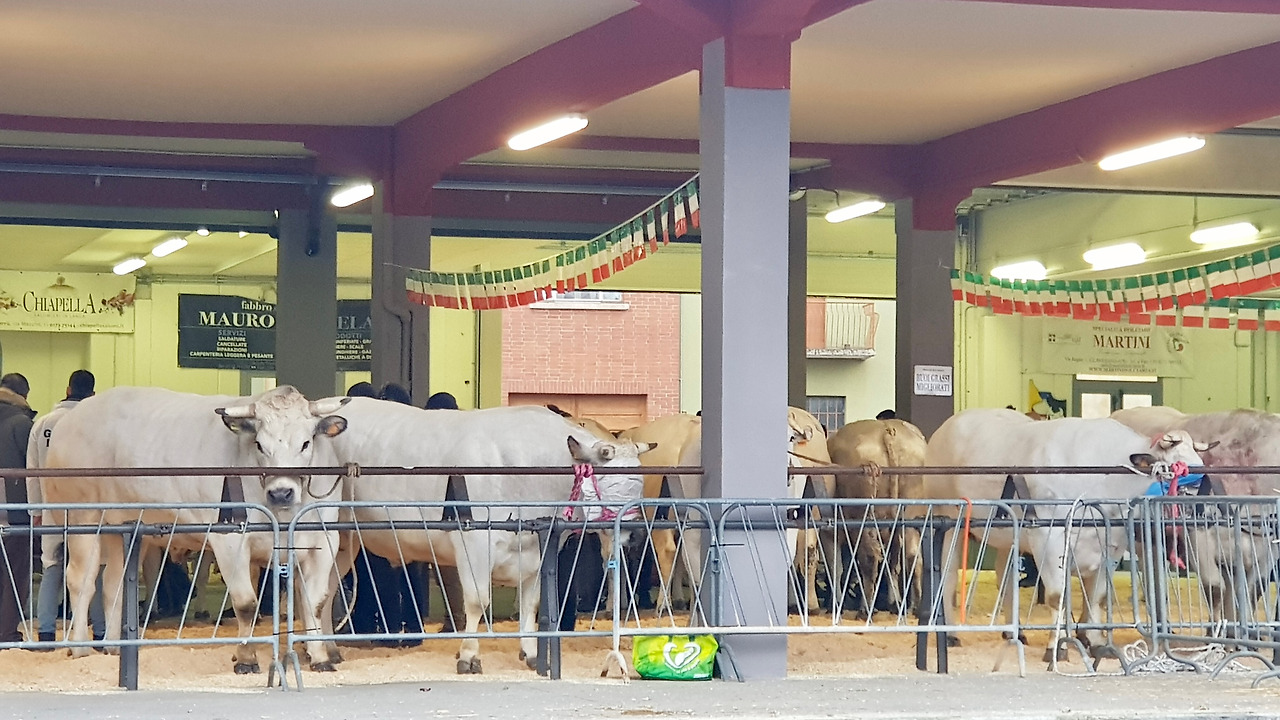 크리스마스 장도 구경하고, ‘아니, 너희도 여기에?’ 아는 얼굴도 인사도 하고, 악사 노래도 듣다 보니 발걸음은 어느새 새하얗고 커다란 피에몬테 토종 육우, 부에 그라쏘(Bue Grasso) 박람회 근처에 다 왔습니다.