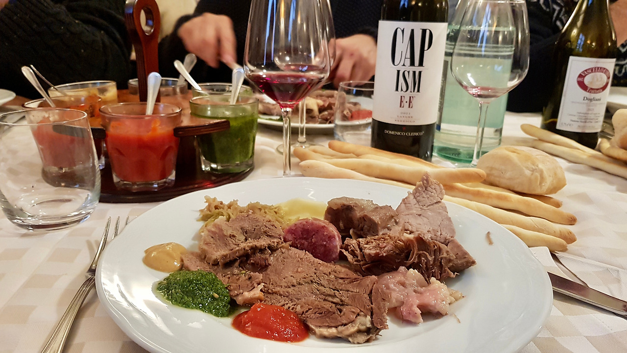 메뉴 따위는 없습니다. 자리에 앉자마자 하우스 와인이 척 하니 올라오고, 그 뒤를 이어 얇게 자른 갖은 살라미, 육회(battuta di fassona), 인살라따 루싸(insalata russa 러시아와 상관없지만 이름만 러시아 샐러드), 고기 속을 채운 납작한 이탈리아식 만두 라비올리를 차례대로 권하십니다. "저희는 볼리또 축제니까 볼리또 먹을래요." 옆 테이블 손님들이 차례대로 대식가의 면모를 드러내는 걸 보면서 볼리또를 기다립니다.