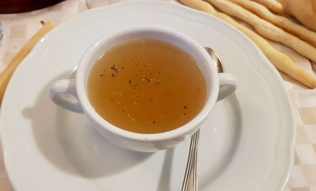 한 숟가락만 떠서 들이켜도 입술에 진득한 느낌이 나는 젤라틴 가득한 육수에 갓 갈아낸 후추와 소금을 조금 넣습니다. 작은 또르뗄리를 넣어도 좋지만, 피에몬테식 바삭한 빵 그리시니(Grissini)를 조금 잘라 육수에 퐁 담갔다 바로 건져 육수와 함께 먹으니 산해진미가 따로 없습니다.