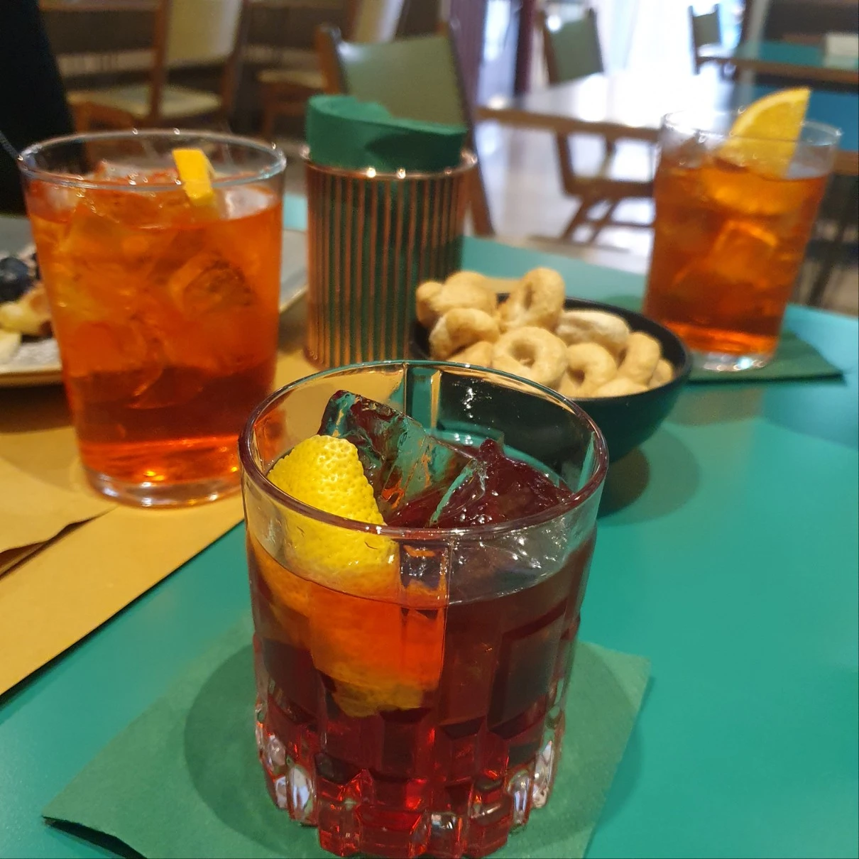 너무 달지도 않고 너무 쓰지도 않게 마시고 싶을 땐 아페롤과 캄파리를 반반씩 넣고 만들어달라고 하지요. 아페롤의 오렌지 색과 캄파리의 붉은색이 그라데이션 층을 내니 색에서부터 더 매력적인 자태를 뽐내거든요.
