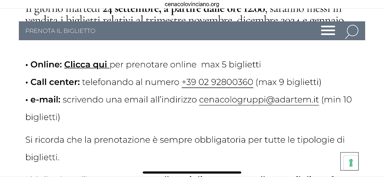 차라리 10인 이상 단체 예매라면 비교적 간편하게 이메일 예약 문의를 하면 될 텐데 말이지요. 7장 예매를 희망하는 지인의 경우처럼 6장~9장까지 예약하고 싶은 사람은 전화 예약만 가능하다고 명시되어 있으니, 5인 이상 10인 이하 여행사 없이 움직이는 단체 여행객들은 당황할 수밖에요. '헐...... 입장권 7장 함께 예매하자고 연결이 되면 기적이라는 최후의 만찬 이탈리아 콜센터까지 국제 전화를 하라구요?'