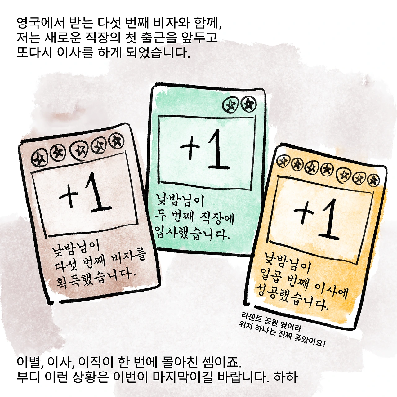 낮밤툰 17화에서는 16화에 이어, 한꺼번에 찾아왔던 이별·이사·이직의 순간을 간략하게 담아보았습니다. 돌이켜보니 정말 큰일이었는데, 지금 생각해보면 그 모든 일들이 신기하게도 더 좋은 방향으로 흘러갔던 것 같아요.