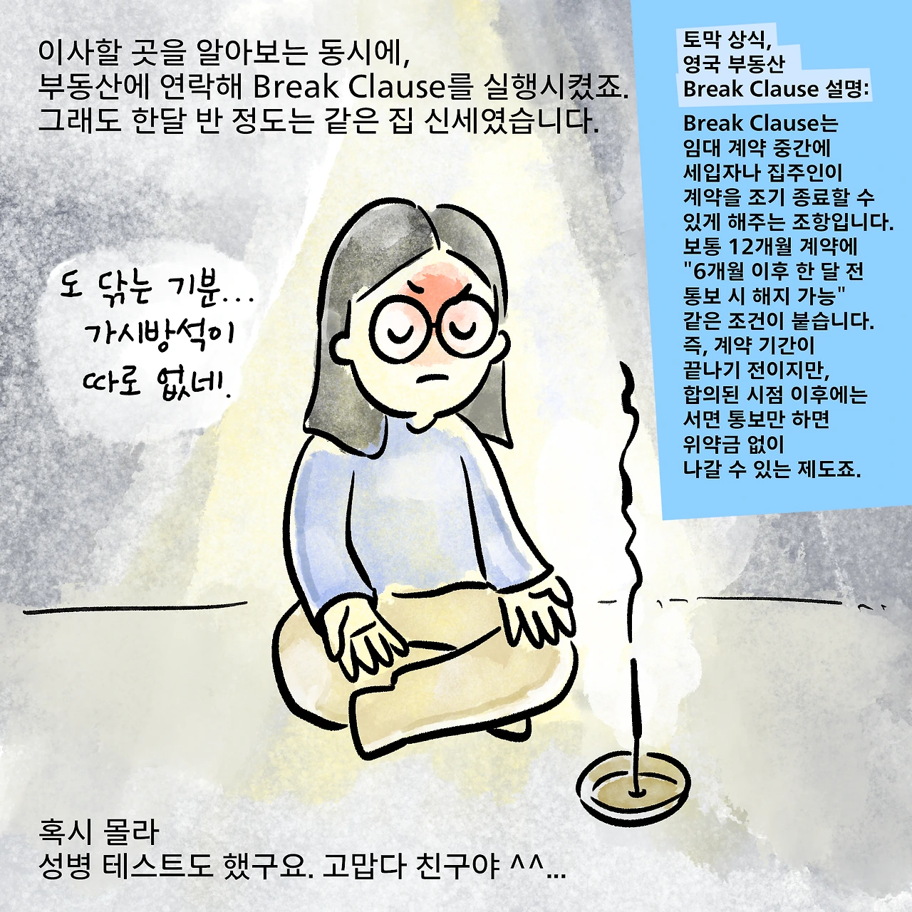 전 직장은 런던에서 일할 기회를 준 소중한 곳이었지만 여러 이유로 진절머리가 나서 더는 버티기 힘든 상황이었고, 구남친도 함께 미래를 그려가기엔 맞지 않는 사람이었습니다. 집 또한 계약이 끝날 때까지 살고 싶어도 혼자서는 렌트를 감당할 수 없어서 나올 수밖에 없었고요.