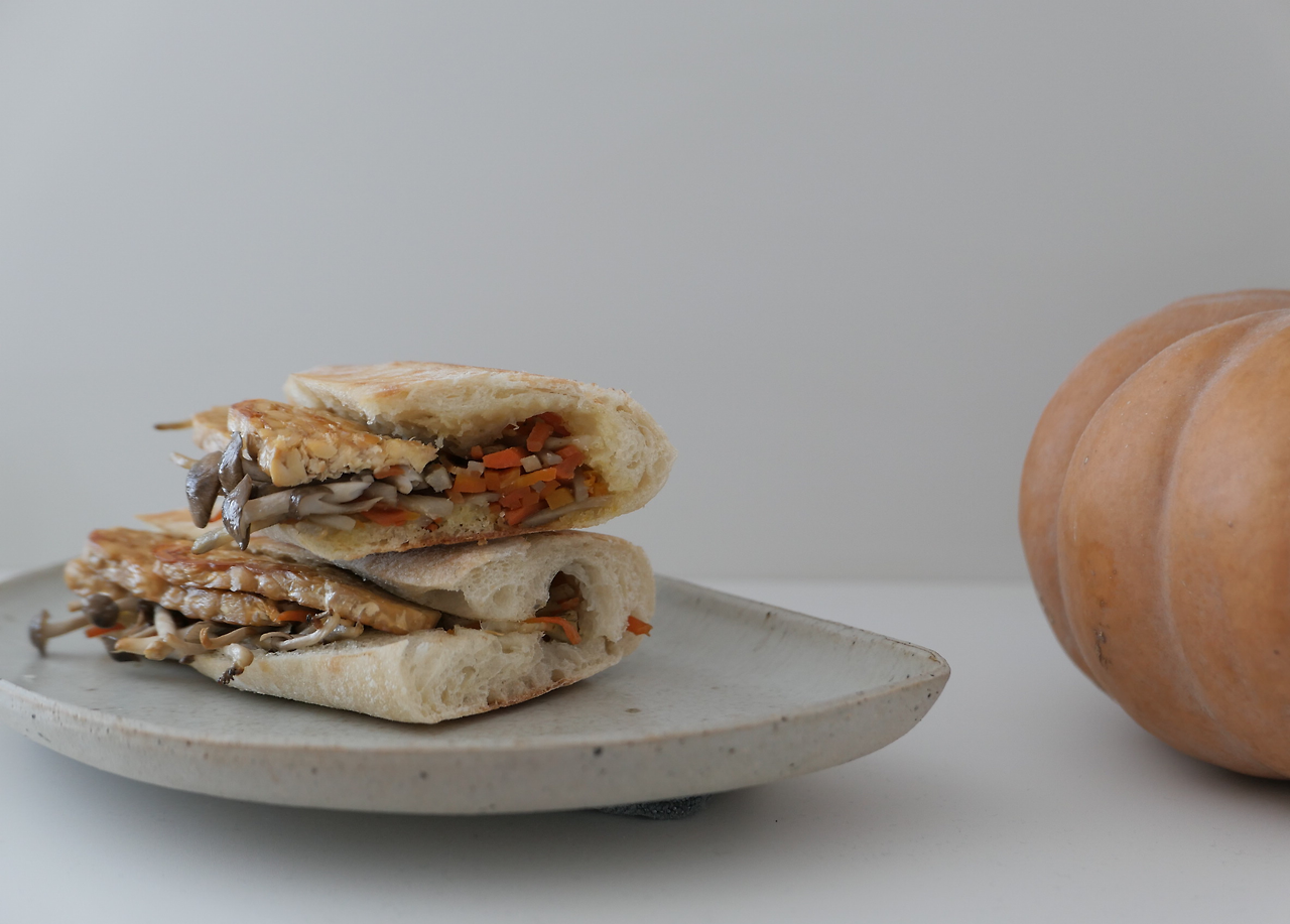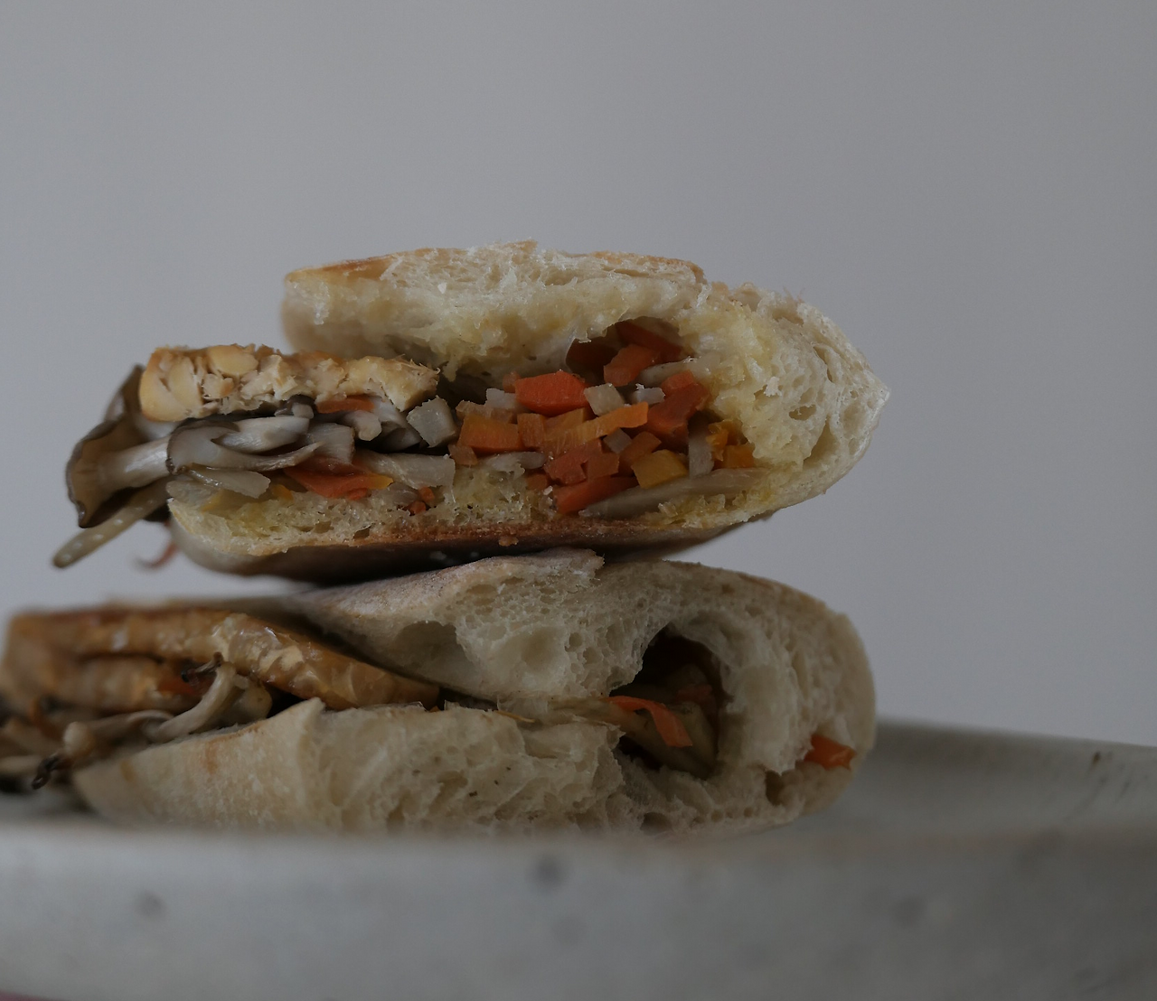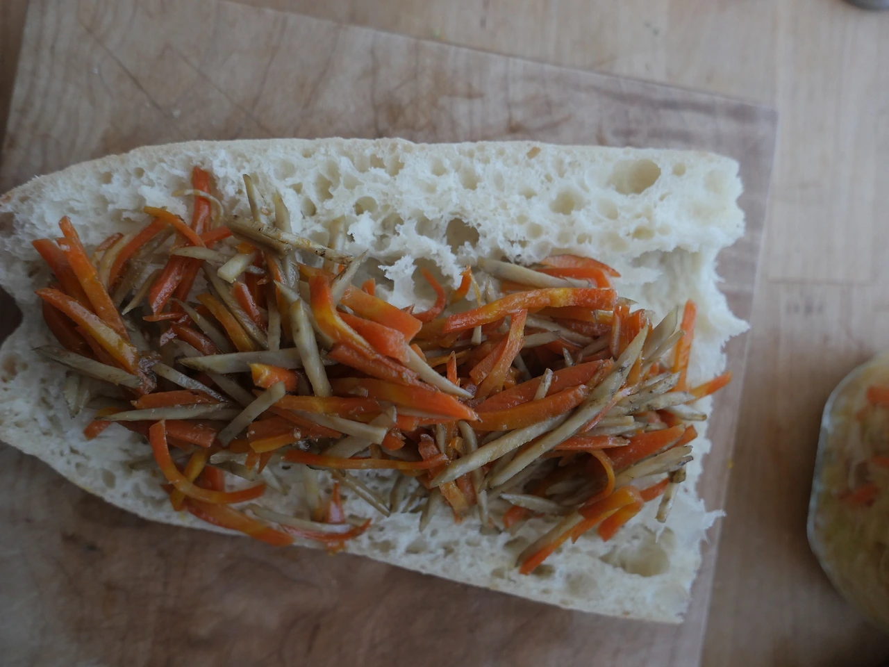 뿌리채소를 참 좋아하지만 물에 빠진 뿌리채소는 뭔가 어색해서 볶는 걸 좋아해. 우엉과 당근을 가볍게 볶다가 맛간장 등으로 조미를 한 긴삐라는 빛나는 배우의 무명시절 같아. 어제 쌀밥 반찬으로 먹으면서 이것이 어떻게 변화할 수 있을까 상상을 했어. 그래서 나온 샌드위치는 채식계의 소시지빵같이 빵 중에 가장 밥 같아서 ‘밥을 먹어야지 빵만 먹냐’는 잔소리에 조금 당당할 수 있겠다 싶었어.