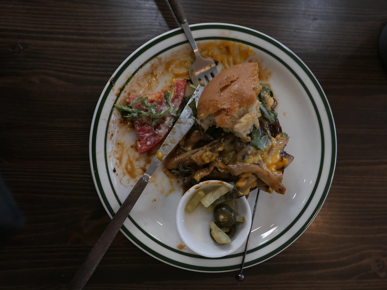 처음에 영우 김밥 이야기로 글을 시작했잖아. 뱃속이 환한 김밥. 이 버거가 그랬어. 영우라면 이 버거를 좋아했을듯해. 고기가 되고 싶은 채소, 고기를 먹고 싶은 사람을 위한 채소, 고기가 우월하다는 암시를 품고 있는 채소. 이런 것들은 알 수 없는 패티로 나를 혼란스럽게 할 수 있어. 응, 그런 적이 종종보다는 자주 있었어. 오늘의 버거는 참 그녀스럽게도 '여기 버섯 있어요!' 하면서 버섯들이 꼬물꼬물 흘러나오는데, 왜 그런 거 있잖아, 너무 그 사람이 그 사람스러우면 웃음이 나는 거. 'It's so you.' (참 너도 너다.)라는 말을 늘 칭찬으로 여기고 그 말을 들을 때마다 어깨 으쓱하는 나에게 오늘의 버거는 함박웃음이었어.