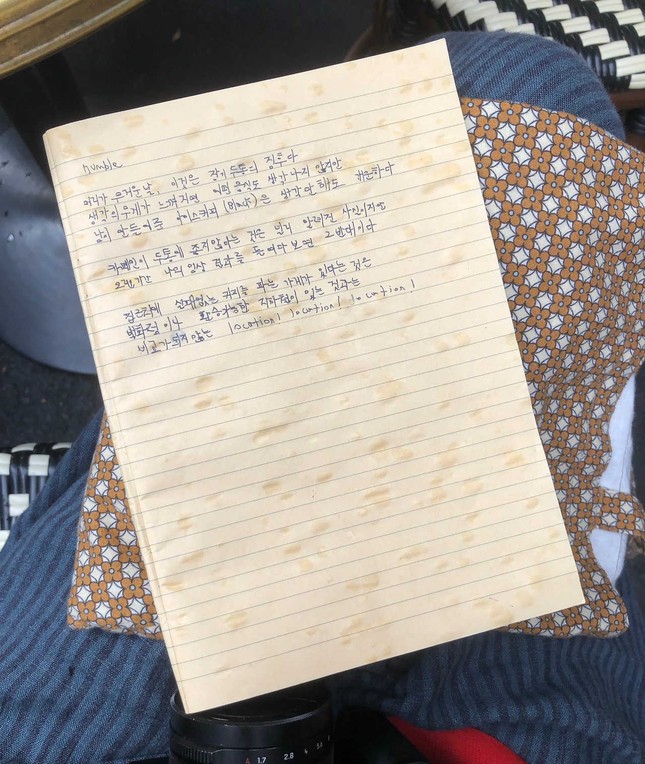 빗방울이 떨어진다. 종종 있는 일이다. 거세지 않을 거란 걸 알고 있다. 아무 일 없다는 듯 밖에 앉은 모든 이들이 테이블을 떠나지 않았고 내 어깨 위로 톡톡, 노트 위에 톡톡, 커피잔 안에 톡톡 떨어지는 빗방울을 개의치 않는다. 아니 오히려 좋다.