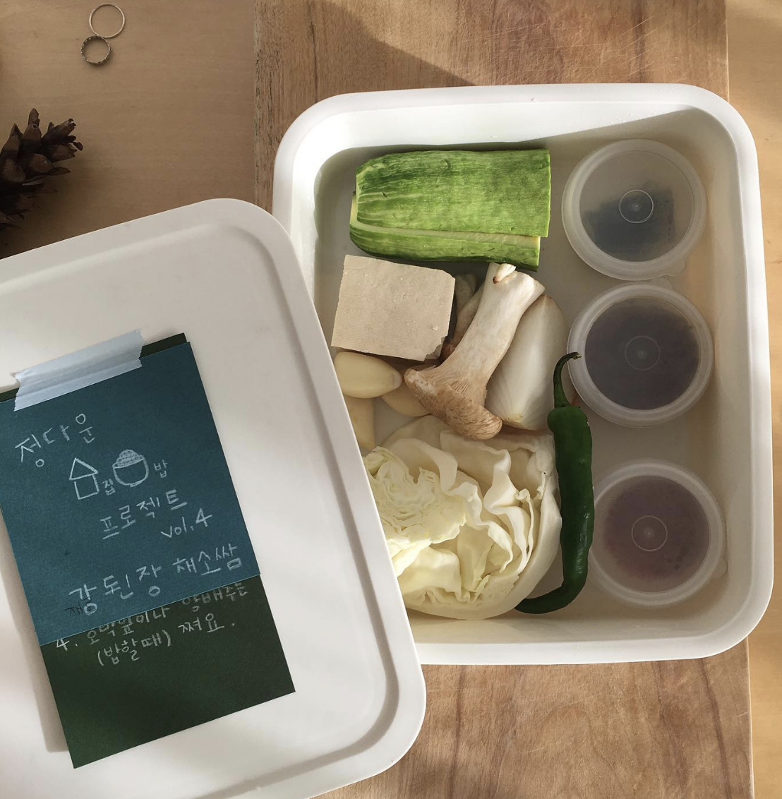 나는 그녀가 10개가 넘는 재료와 10단계가 넘는 요리 과정을 이해하지 않아도 되도록 '정다운집밥프로젝트'라는 이름을 달고 모든 재료를 적당한 크기로 담은 키트를 가져다주었다. 요리 과정은 4단계이다. 자른다. 섞는다. 끓인다 담는다. 하지만 생각지도 못한 일이 벌어졌다.