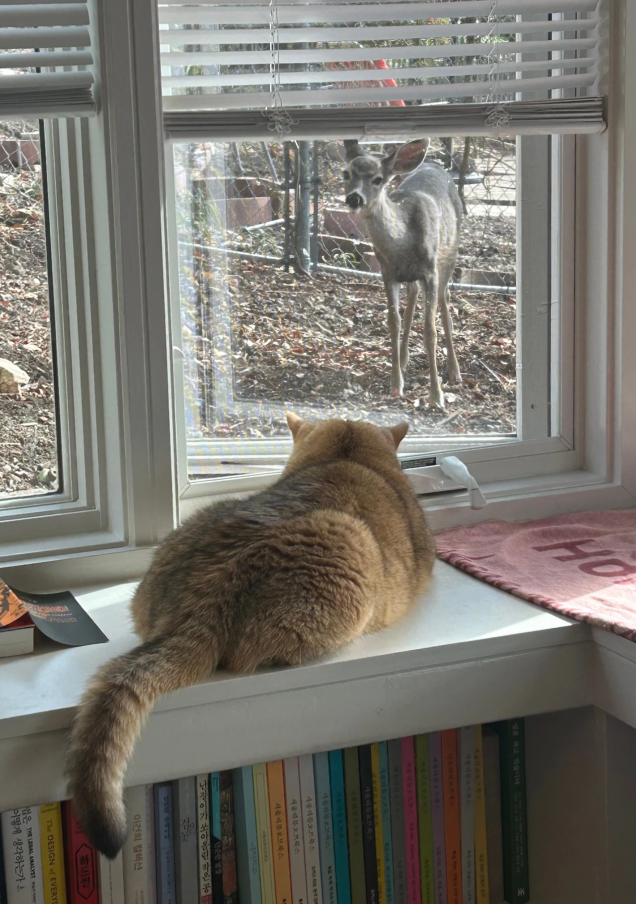 한 2주 정도 여기서 지낸 부모님이 한국에 가셨다. 우리 집엔 다시 나 와이프 고양이 워토 셋이 남았다. 요즘 워토는 내가 서재로 재택 출근할 때 자기도 서재 창문 앞으로 온다. 유투브에 풍덩 빠진 사람처럼 거기서 뒷마당에 오는 새, 다람쥐, 노루, 길냥이, 카요티를 하루 종일 본다. 가든TV 채널에 좋댓구알 다 박은 것 같다.