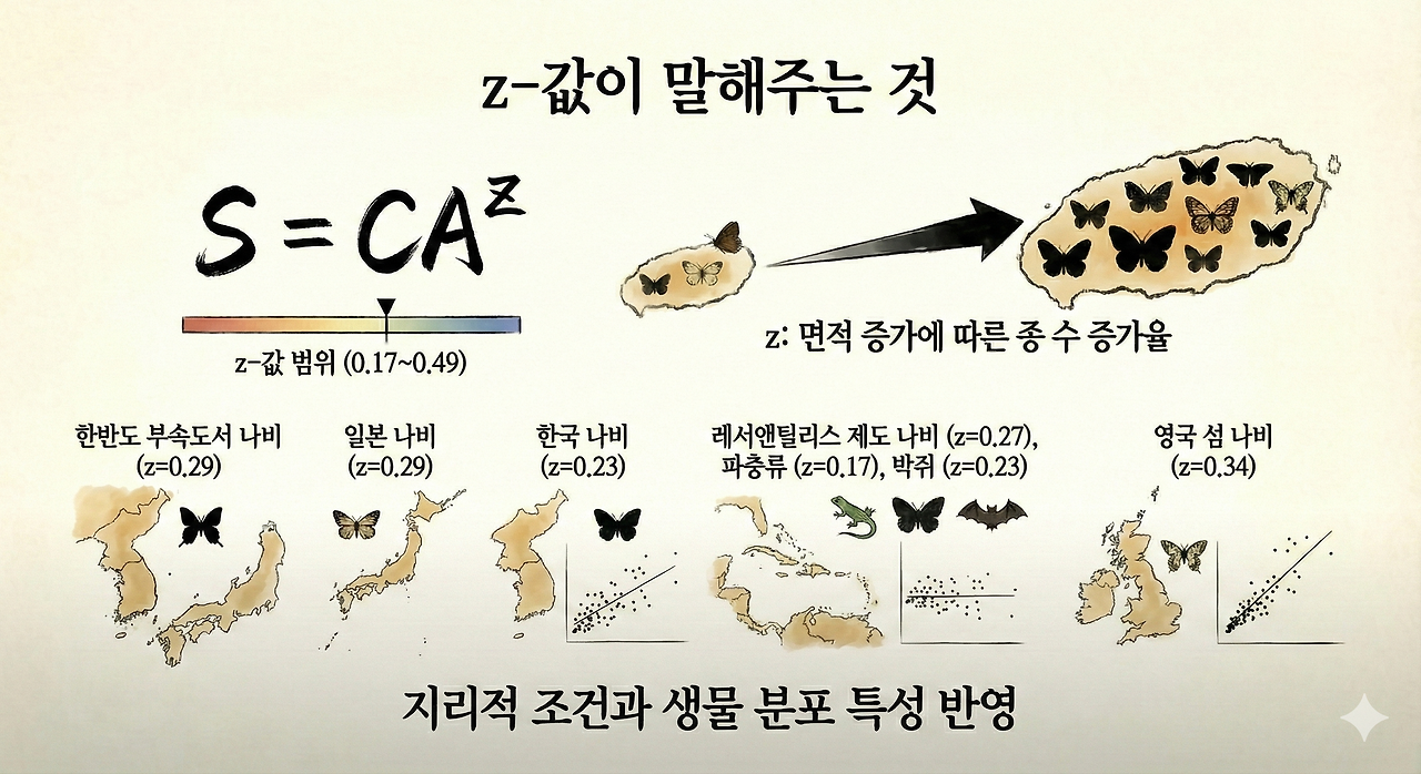생물지리학에서는 종-면적 관계를 S=CAᶻ라는 식으로 표현합니다. 여기서 z는 면적이 증가할 때 종 수가 얼마나 빠르게 늘어나는지를 보여주는 상수입니다. 일반적으로 z값은 0.17~0.49 범위를 보입니다.