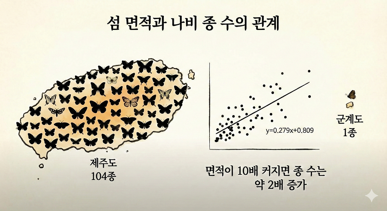 한반도 연안에 흩어진 섬들을 들여다보면 흥미로운 패턴이 보입니다. 큰 섬에는 다양한 나비가 살고, 작은 섬에는 몇 종만 발견됩니다. 이것이 단순히 우연일까요? 생물지리학자들은 이를 ’ 평형설(equilibrium theory)’로 설명합니다. 섬의 종 수는 면적과 본토로부터의 거리라는 두 요인이 결정한다는 이론입니다.