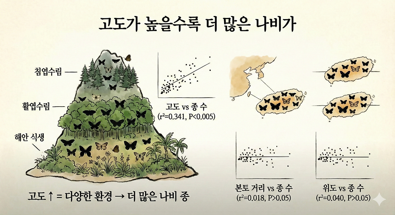 섬의 최고 고도 역시 중요한 변수였습니다. 고도가 높은 섬일수록 더 많은 나비 종이 서식했습니다(r²=0.341, P <0.005). 이는 고도가 높으면 다양한 환경이 만들어지기 때문입니다. 산 아래에는 해안 식생이, 중턱에는 활엽수림이, 정상 부근에는 침엽수림이 분포하면서 각기 다른 식물을 먹는 나비들이 공존할 수 있는 것입니다.
