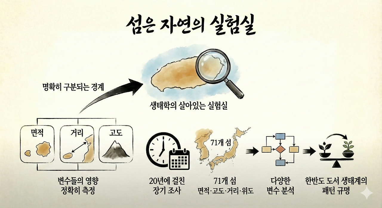 이 연구가 중요한 이유는 섬이 생태학의 살아있는 실험실이기 때문입니다. 본토와 달리 명확히 구분되는 경계를 가진 섬에서는 면적, 거리, 고도 같은 변수들이 생물 다양성에 미치는 영향을 비교적 정확히 측정할 수 있습니다.