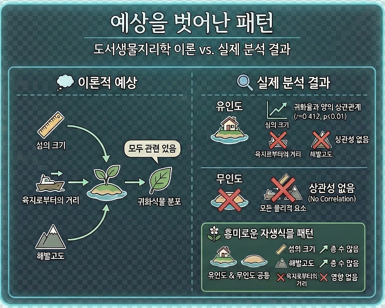 그런데 전라남도 도서지역 241곳의 귀화식물을 분석한 연구는 흥미로운 결과를 보여줍니다. 이 고전 이론이 예상보다 잘 들어맞지 않는다는 것입니다.
