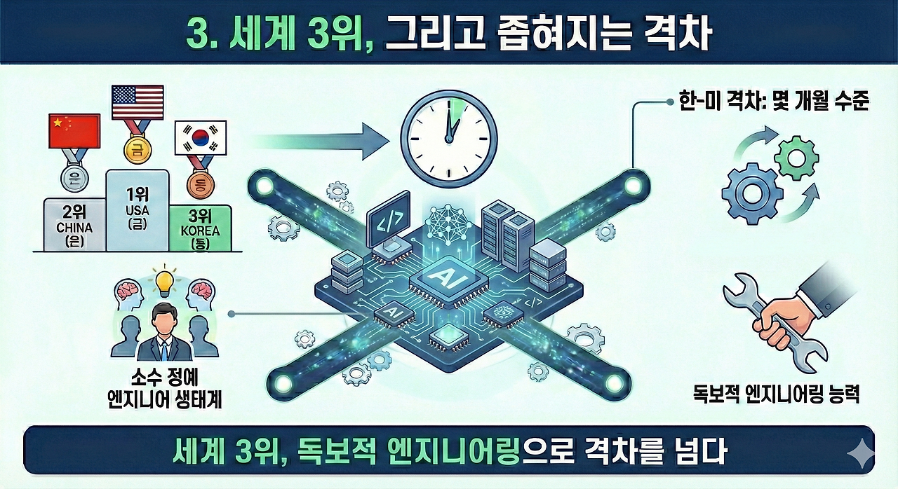 현재 한국의 AI 경쟁력은 미국, 중국에 이어 세계 3위로 평가받고 있어요. 영국, 프랑스, 캐나다 같은 전통적 IT 강국들을 제쳤죠. 특히 미국 전문가들 사이에서는 한-미 간 엔지니어링 격차가 단 몇 개월 수준으로 좁혀졌다는 이야기가 나옵니다.