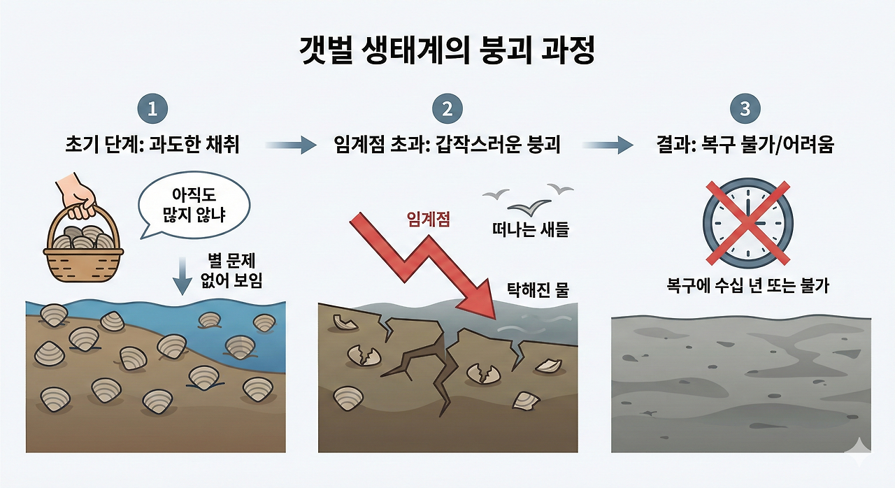 갯벌 생태계를 예로 들어볼게요. 처음 몇 년간은 조개를 과도하게 캐도 별 문제가 안 보입니다. “봐라, 아직도 많지 않냐”라고 사람들은 말하죠. 그런데 어느 순간 임계점을 넘으면 갑자기 붕괴합니다. 조개가 사라지고, 조개를 먹고살던 새들이 떠나고, 갯벌의 진흙 구조가 바뀌고, 물이 탁해집니다. 일단 이렇게 되면 복구하는 데 수십 년이 걸립니다. 어떤 경우에는 아예 원래 상태로 돌아가지 못합니다.