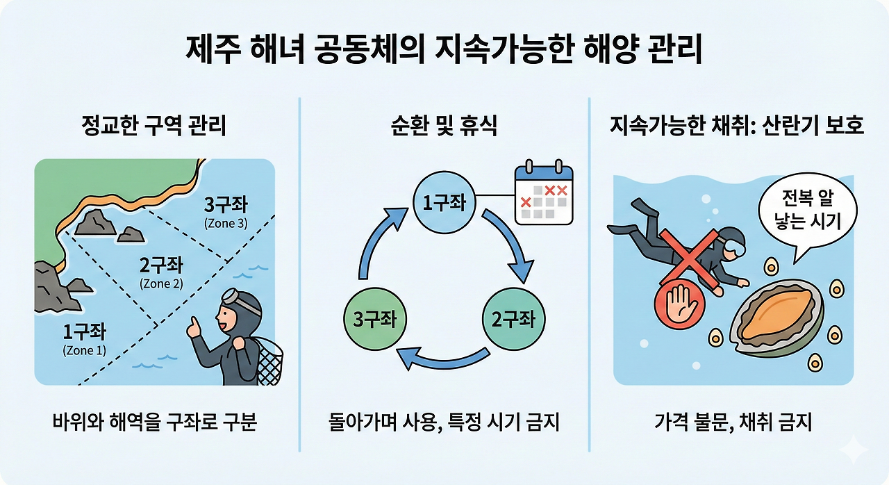 제주 해녀 공동체를 생각해 보세요. 각 마을의 해녀회는 물질 구역을 정교하게 관리합니다. 이 바위는 1구좌, 저 해역은 2구좌 이런 식으로요. 각 구역은 돌아가며 사용되고, 특정 시기에는 금지됩니다. 전복이 알을 낳는 시기에는 아무리 가격이 좋아도 따지 않습니다.