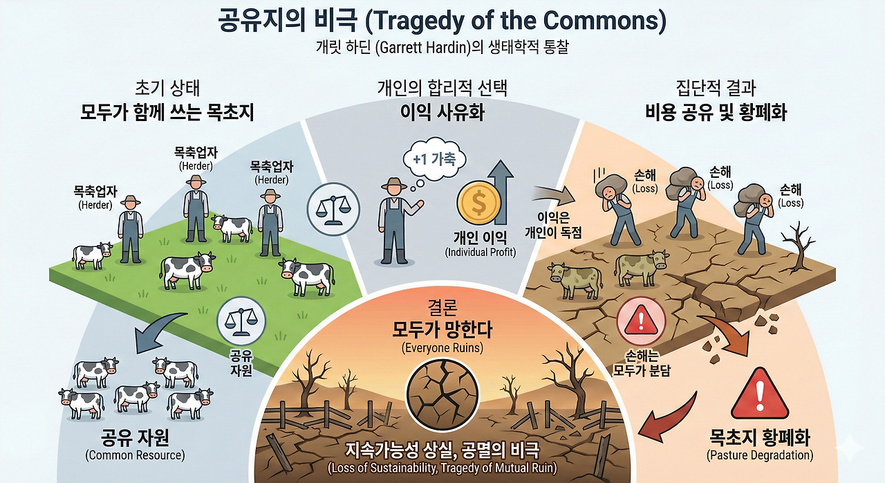 미국의 생태학자 개릿 하딘은 “공유지의 비극”이라는 논문에서 충격적인 주장을 했습니다. 모두가 함께 쓰는 목초지가 있다고 상상해 보세요. 각 목축업자는 자기 가축을 한 마리 더 풀어놓으면 그 이익은 자신이 다 가져가지만, 목초지가 황폐해지는 손해는 모든 사람이 나눠 가집니다. 그러니 합리적인 사람이라면 누구나 가축을 계속 늘릴 것이고, 결국 목초지는 망가져 모두가 망한다는 겁니다.