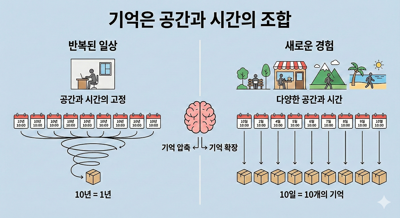 기억은 공간과 시간의 조합입니다. 매일 같은 공간에서 같은 일을 반복하면, 뇌는 그걸 새로운 기억으로 저장하지 않습니다. 열 개의 날을 하나로 묶어버리죠. 10년이 1년처럼 압축되는 겁니다.