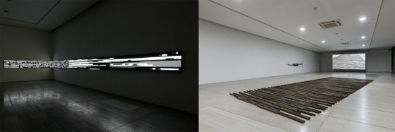 그리고는 전시장을 가득 메운 영상작품이었다. 작은 점들의 구성이 폭포처럼 떨어지며 무중력의 공간을 떠다니다 선들의 유영으로 이어지는 영상 안에는 박종규의 작업의 모든 요소들이 포함되어 있었다. 그리고 전시는 바코드를 연상케 하는 선 작업의 철 입체 조형과 그것의 그림자 혹은 흔적으로 해석되는 시트지가 바닥에 설치되어 있었고, 전면에는 대형 LED 조명판에 드론의 시선에서 촬영한 영상이 소개되었다.