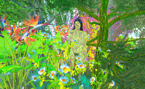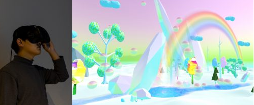 김안나의 가상현실 작품 역시 비현실적인 이미지들이다. 형광빛이 도는 밝고 초현실적인 컬러, 무지개와 나무, 구름을 걷는 듯한 느낌. <Rainbow Spectra v. 1.0>. 유토피아가 있다면 이런 모습일까 싶기도 하다. 그 안을 이리저리 둘러본다. 익숙치 않은 컨트롤러를 이리저리 사용해보면서 산책하듯 이미지의 세계로 들어간다. 그 어떤 사건도 없으니 긴장할 필요도 없다. 디지털 픽셀로 만들어졌음을 굳이 숨기지도 않는다. 그것이 현실이 아님을, 만질수 있는 물성이 없음을 이미 알고 있다. 속이려 하지 않기에 속아넘어가지 않으려 애쓸 필요도 없다. 눈앞에 펼쳐진 세계를 천천히 돌아보면 된다.