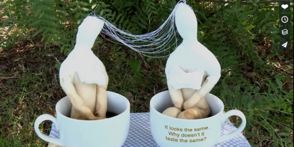초기작인 <커피 타임>에서도 역시 이런 특징이 잘 나타난다. 두 개의 하얀색의 커피 잔이 테이블 위에 놓여있고, 그 안에 실로 연결된 하얀 작은 인형이 앉아있다. 누군가 와서 커피를 따르자 인형은 점점 커피색으로 물들어가고, 두 여자의 수다가 시작된다. 한국어로 진행되는 이야기는 각각의 커피 잔 안에 영문자막으로 표현된다. 오늘 10시까지 수업하는 날 아니냐는 질문에 청강인데 오늘 그냥 일찍 왔다며 뚝, 끝나버리는 대화. 그리고 텍스트로 처리되는 대화의 전모. 이 이야기는 작가가 외국에 유학 간 첫 해에 엄마와 나누었던 스카이프 통화를 녹음하여 재편집한 것이라고, 대화에 나오는 커피살 돈이 없다는 그 불쌍한 남자는 자신의 아빠라고 덤덤하게 텍스트로 마무리 한다. 시종일관 커피 잔에 자막으로 표현되는 대화, 점점 커피색으로 물드는 인형. 흥미롭게도 김민정은 커피타임이라는 정직한(?) 제목을 통해 감정적으로 연결되어 있으나 물리적으로 떨어져 있는 엄마와의 일상적인 대화를 시각적, 후각적, 청각적으로 풀어내었다. 영상을 보는 내내 소소한 일상의 티타임에 초대된 느낌이 드는 것은, 그 어디에도 작가가 무리한 편집이나 과한 메시지를 담으려고 애쓰지 않았기 때문일 것이다. <커피타임>은 일종의 산문시 같았다.