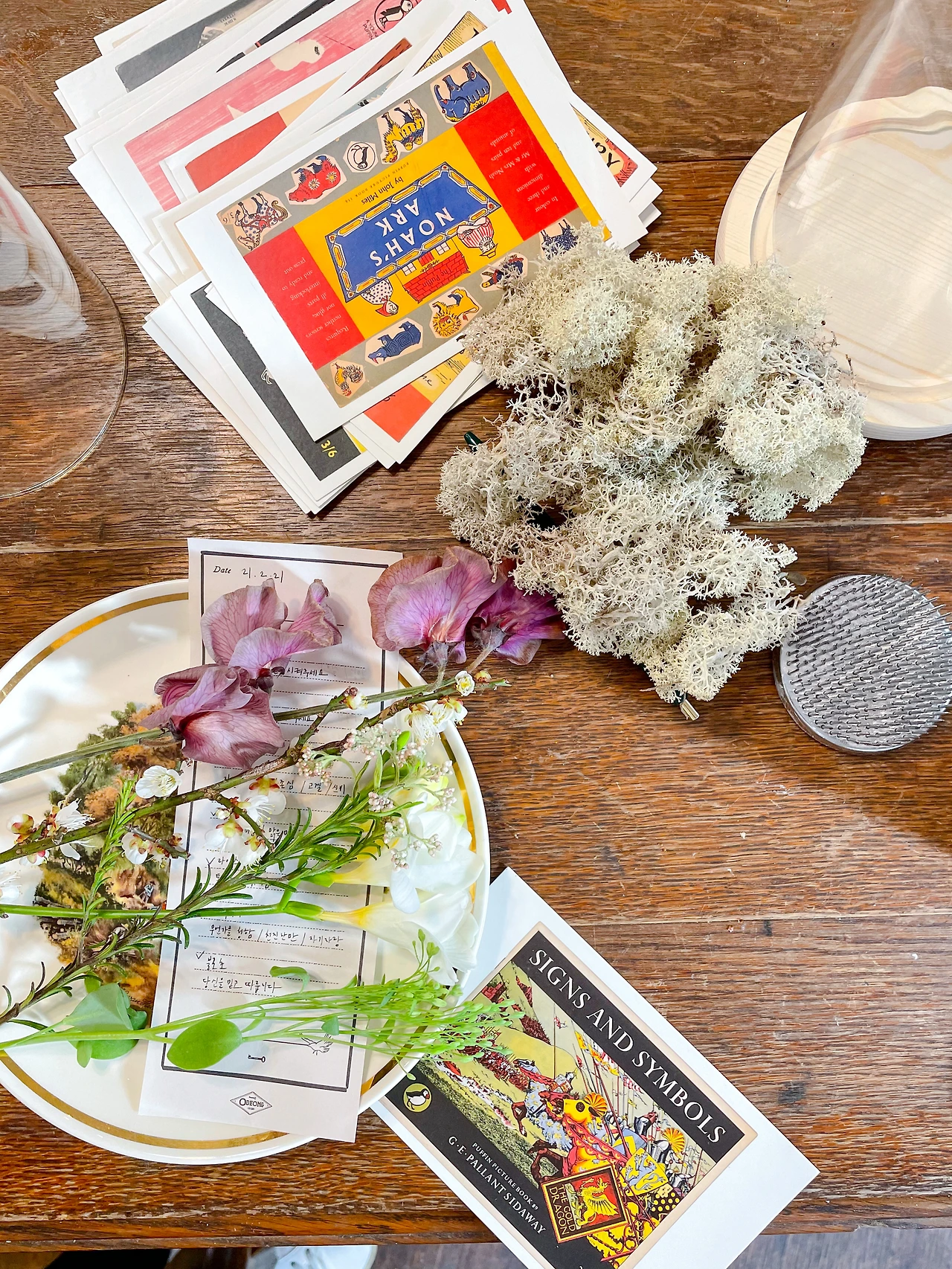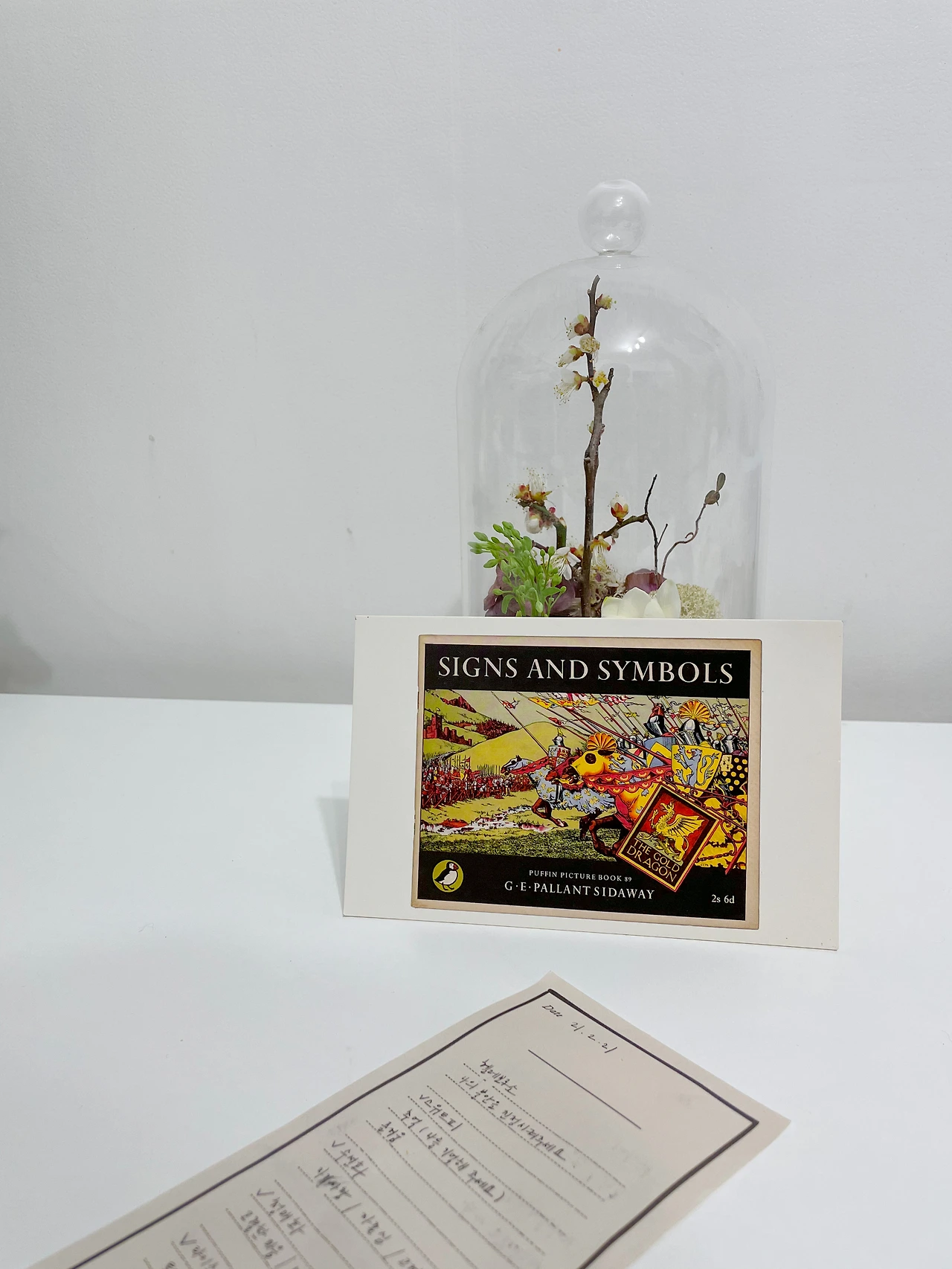취미로 꽂꽂이를 배우는데, 선생님의 손이 큰 덕분에 내 마음처럼 쏟아질 것 같은 작품을 주로 만든다. 지난주 수업은 글쓰기 같았다. ‘꽃말로 스토리텔링 하기’로, 유리 돔을 편지지 삼아 꽃을 배치하는 수업이었다. 유리 돔의 사이즈가 작아 꽃을 최소한으로 사용하는 게 핵심이었다. 남편에게 보낼 다섯 가지 꽃말을 선택하고, 프리저브드 이끼를 풍성하게 깔았다. 프리저브드 이끼에 나뭇가지 하나가 꽂혀있었다. 이 가지를 시작으로 꽃을 배치했다. ‘최소한의 꽃으로 글쓰기’ 에 집중하다보니 분재 같은 작품이 나왔다.