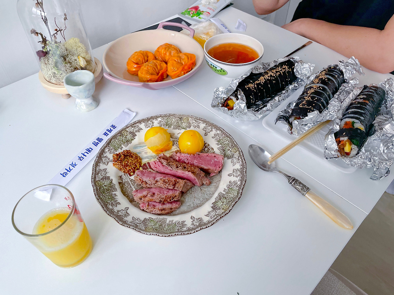 때문에 남편이 안전하게 가자며 김밥 맛집에서 사 왔다. 여기에 냉동실에 있던 창화당 김치만두(남편용)와 안심 스테이크 한 덩어리, 그리고 GAP 마초칼라토마토(사진보다 왕 큼)를 꺼냈다.
