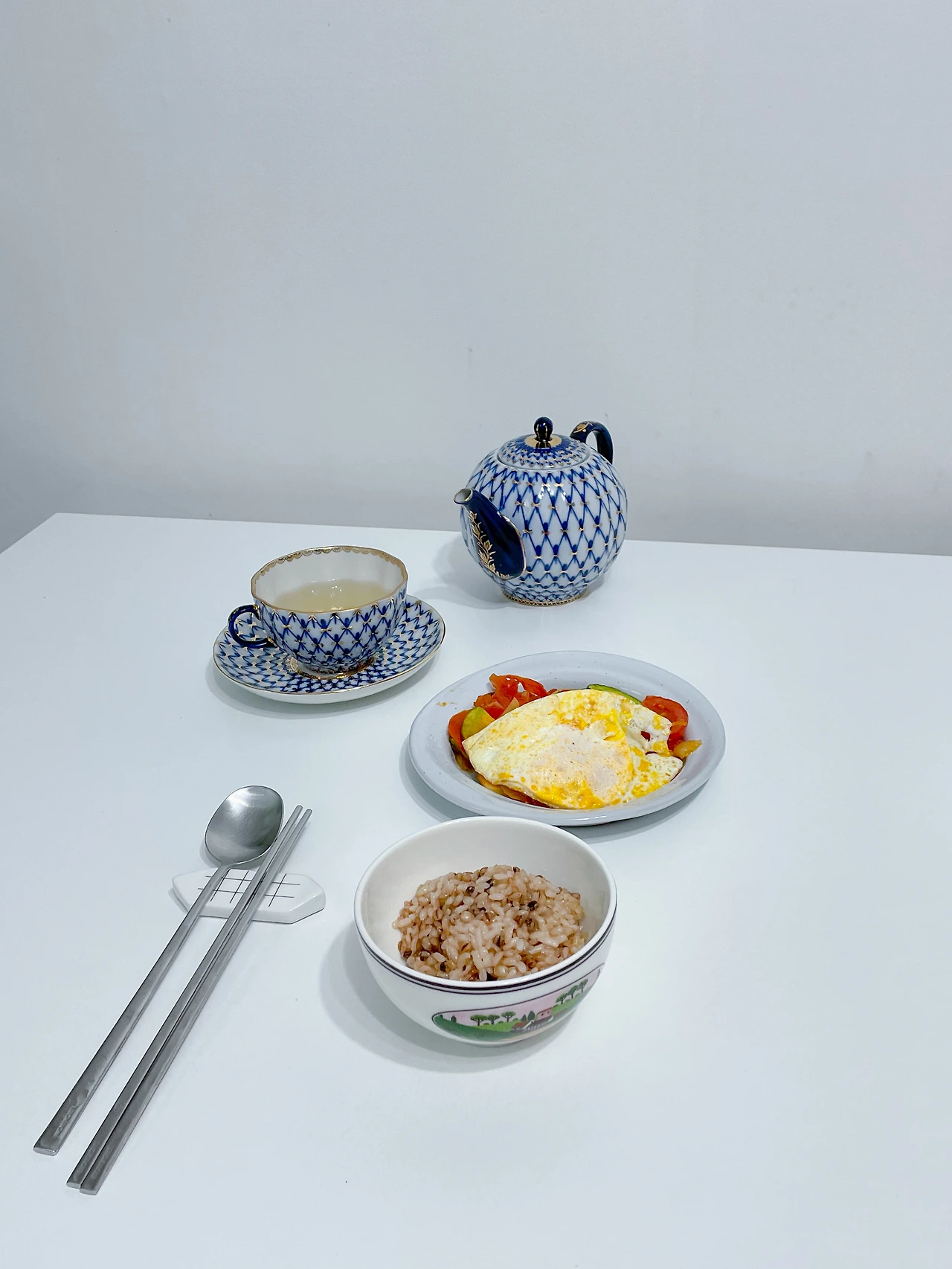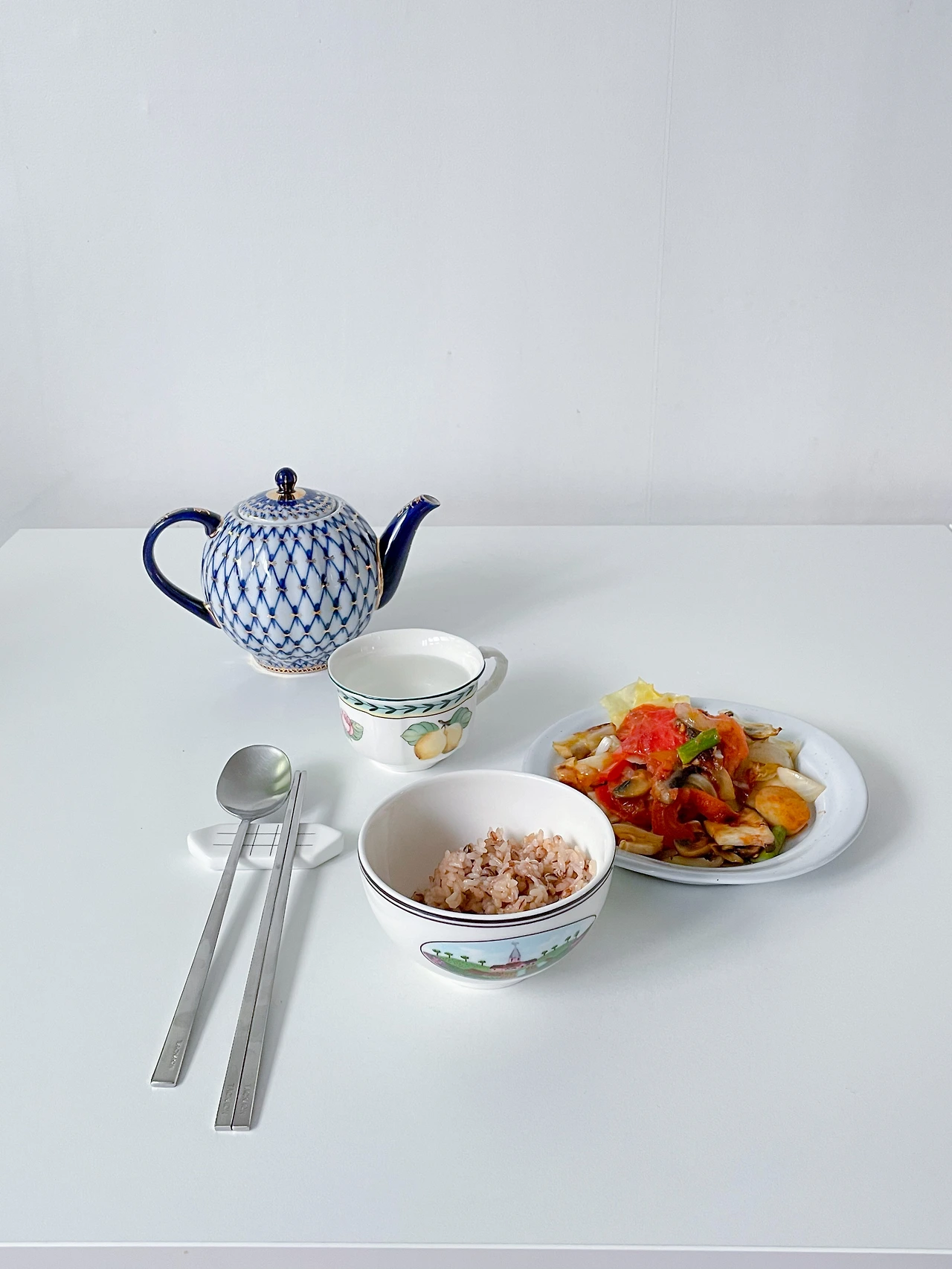 채소를 오래 익히면 단맛과 바삭한 맛이 난다. 나는 이 맛을 선호해 오래 익히는데, 팬에 채소를 올려놓고 빨래를 개거나 설거지, 바닥 청소를 하면 어느 정도 익어있다. 인덕션 기준 7에서 약 2-30분 정도 익히면 된다.전날 백미와 보리, 현미를 섞어 밥을 해놓았기에 편했다.
