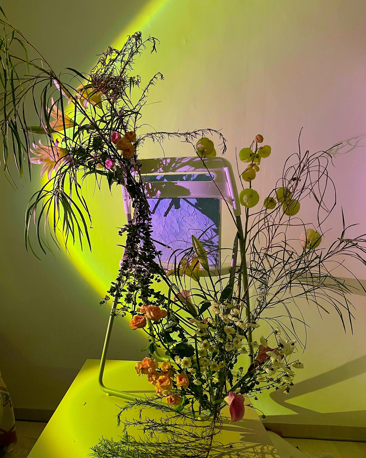 의자 위엔 수강생 분이 선물해준 그림을 놓았다. 의자의 정 가운데에 내 마음이 있고, 위아래를 자연이 감싸주는 느낌을 내고 싶었다. 나만의 에덴동산을 만드는 느낌이랄까. 늘 느끼지만, 누구나 마음속에 저마다의 하늘을 품고 산다. 로맨틱한 석양이 비추는 하늘 일수도, 혹은 폭풍우 치는 하늘이, 또는 잔잔한 하늘일 수도 있다. 치킨 와이어에 소재를 과감하게 넣었다. 위아래가 이어지는, 그래서 어디가 시작이고 끝인지 알 수 없는 형태를 만들고 싶었다. 마음에서 들끓는 감정을 표출하고 싶었다. 치킨 와이어를 느슨하게 묶은 탓에 아래쪽 다리의 소재가 앞으로 쏠렸다. 똑바로 세우려는 마음을 버리고 손 가는 대로 작업했다. 마무리를 하고선 친구가 선물한 조명을 비췄다. 조명은 원래 주황색 계열인데, 백합과 빛이 있는 힘껏 부딪혀 새로운 무지개를 만들어 냈다. 시계를 보니 한 시간 반 정도가 지나있었다. 어레인지에 몰입했던지라 시간이 이렇게나 지난 줄 몰랐다. 작품을 완성하고 나니 후련하다.