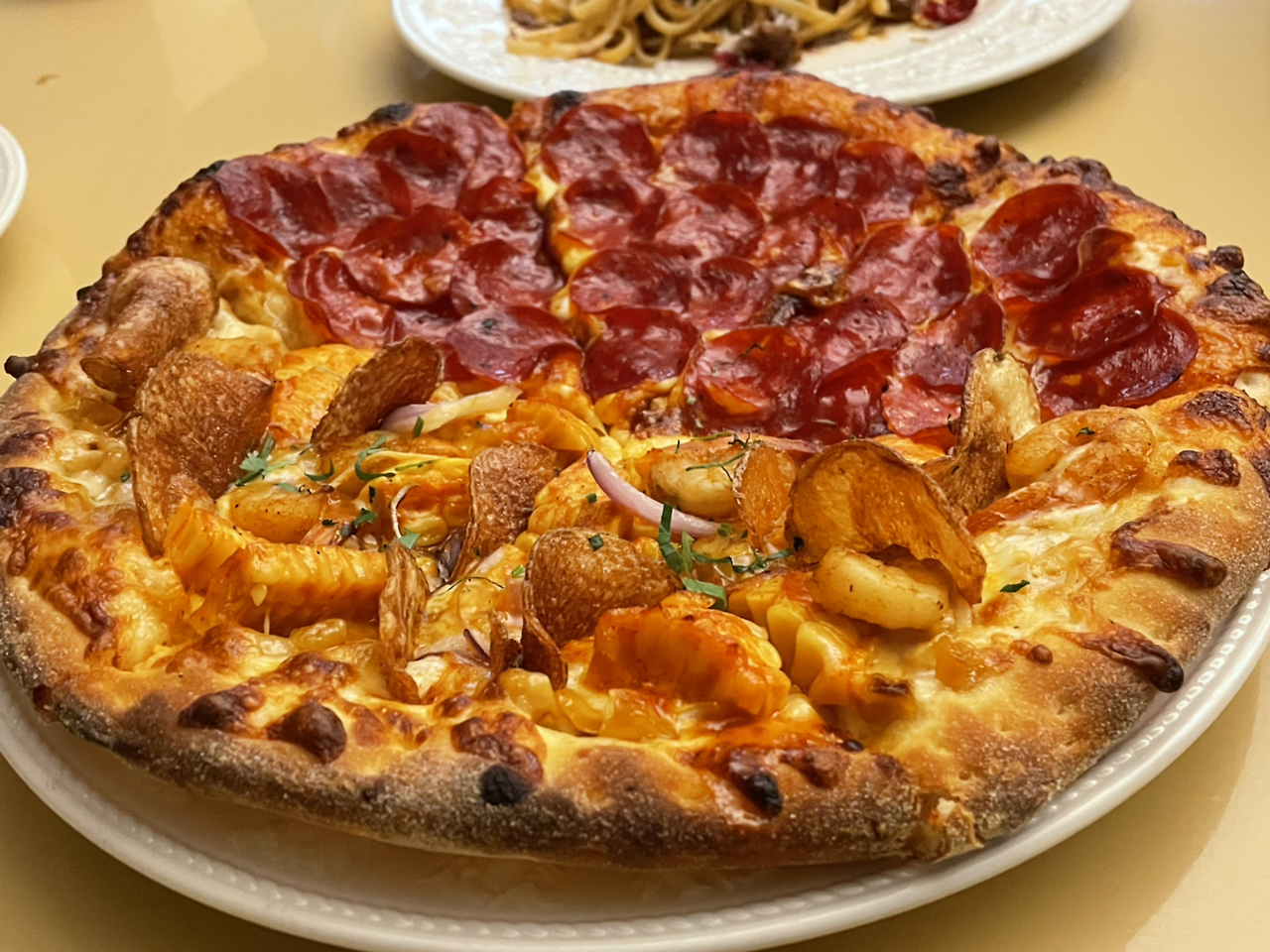 이곳의 시그니처 피자라는 옥수수 피자와 페페로니 피자 반반을 시키고, 화이트 라구와 레드 라구 파스타를 주문했다. 우리가 앉은 테이블은 당구대 처럼 생긴 삼각형의 테이블로, 연한 크림 노란색이 칠해진 유광 재질-아마도- 인 것 같다. 사진을 찍으니 잘 나온다. 테이블 위에는 자주나 기타 빈티지 스토어에서 팔 것 같은 흰색 유약이 대충 입혀진 플로럴 접시와 그 위에는 치즈 커터 겸 나이프와 포크가 있다. 레드 라구 파스타와 화이트 라구 파스타가 먼저 나왔다. 화이트 먼저 먹어 보았다. 보이는 대로 진득하고, 부드러운 맛이다. 레드 라구를 먹어 보았다. 토마토의 맛 보다는 바질? 아니야, 고수? 라임? 이 들어간 상큼함이 느껴졌다.