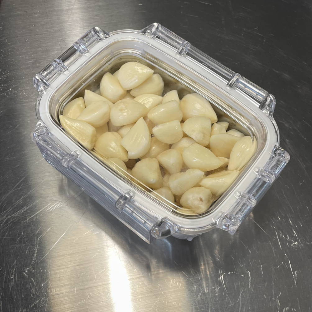 껍질을 벗겨낸 알맹이는 윤기가 흐르고, 색도 연노랑빛으로 빛으로 빛났어요. 용기에 깐 마늘이 쌓일 때마다 힘듦과 뿌듯한 감정이 동시에 올라왔어요. 조금 쉬다가 마늘 까다가를 반복하다 보니, 어느새 마늘을 전부 깠어요. 인간 승리한 기분이었습니다. 하지만 절대 다시는 통마늘을 사지 않을거예요. 경험은 이 정도로 충분한 것 같거든요. 오늘 깐 마늘은 한 알 한 알 소중하게 먹으려고요. 남편에게 생색도 내고 말이죠.