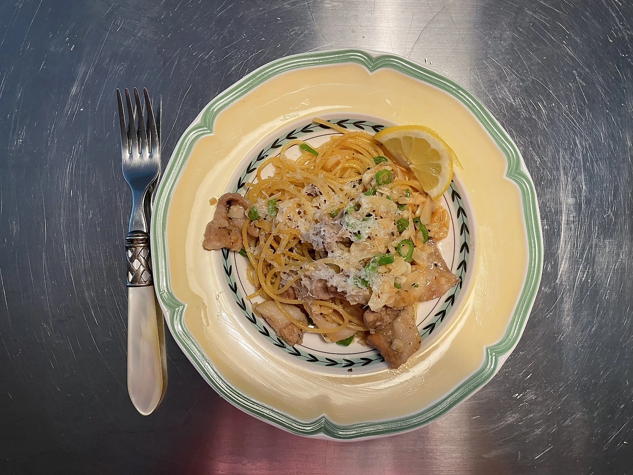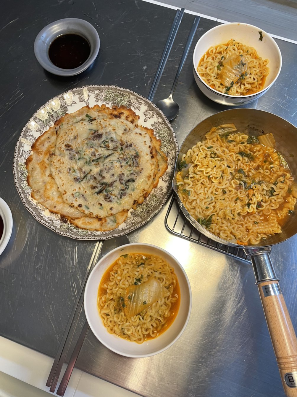 삼겹살이 어느 정도 익으면 불을 약하게 맞추고, 면을 끓인다. 적당한 때에 불을 끄고 면을 삼겹살 팬에 옮겨 담는다. 면은 저마다 선호가 다르다. 이탈리아에서조차 알단테의 기준이 다르다. 우리가 꼬들면 또는 푹 익은 면을 좋아하듯, 그들에게 알단테는 자신이 좋아하는 면 스타일인 것 같다. 어떤 셰프는 심이 씹히는 걸 알단테라고 하고, 다른 셰프는 거의 익은 면을 알단테라고 한다. 살짝 탄탄한 식감의 면을 좋아한다. 남편은 조금 익은 면을 좋아한다. 둘의 중간을 맞추기 위해서는 평소보다 면 꺼내는 시간을 1-2분 정도 늦게 한다. 겉은 투명하지만 집게로 집었을 때 탄탄한 느낌. 그때 면을 팬에 옮겨 담는다. 자칫하면 면이 탈 수 있기에 면수를 자작하게 부어준다. 삼겹살과 마늘, 그리고 페페론치노가 어우러지게 섞는다. 면수가 졸아들면 불 끄고 플레이팅한다. 오랜만에 우리 둘 다 좋아하는 식감의 파스타가 완성됐다. 급하게 넘기지 않고 꼭꼭 씹는다. 그냥, 면의 식감을 오래 기억하고 싶었다.